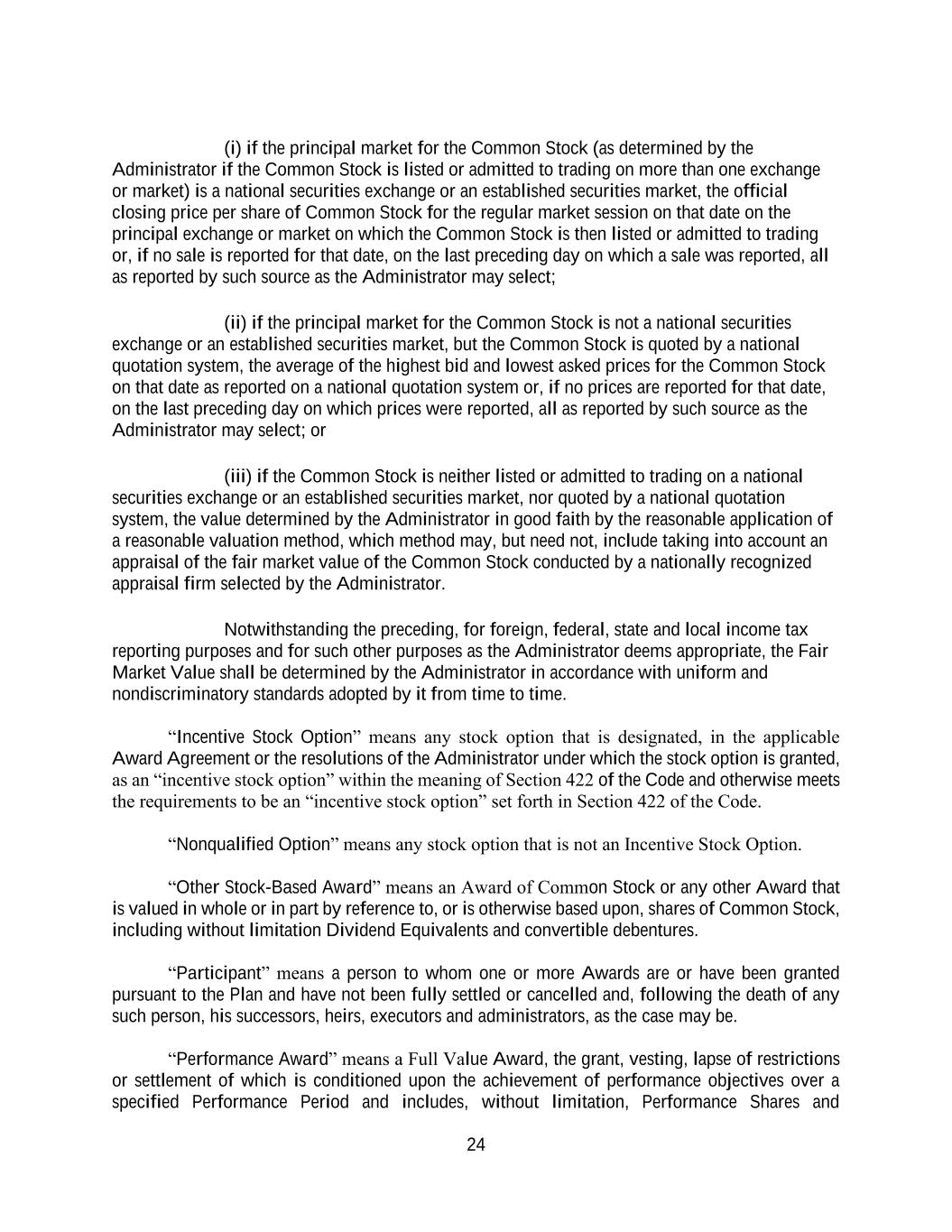 24 (i) if the principal market for the Common Stock (as determined by the Administrator if the Common Stock is listed or admitted to trading on more than one exchange or market) is a national securities exchange or an established securities market, the official closing price per share of Common Stock for the regular market session on that date on the principal exchange or market on which the Common Stock is then listed or admitted to trading or, if no sale is reported for that date, on the last preceding day on which a sale was reported, all as reported by such source as the Administrator may select; (ii) if the principal market for the Common Stock is not a national securities exchange or an established securities market, but the Common Stock is quoted by a national quotation system, the average of the highest bid and lowest asked prices for the Common Stock on that date as reported on a national quotation system or, if no prices are reported for that date, on the last preceding day on which prices were reported, all as reported by such source as the Administrator may select; or (iii) if the Common Stock is neither listed or admitted to trading on a national securities exchange or an established securities market, nor quoted by a national quotation system, the value determined by the Administrator in good faith by the reasonable application of a reasonable valuation method, which method may, but need not, include taking into account an appraisal of the fair market value of the Common Stock conducted by a nationally recognized appraisal firm selected by the Administrator. Notwithstanding the preceding, for foreign, federal, state and local income tax reporting purposes and for such other purposes as the Administrator deems appropriate, the Fair Market Value shall be determined by the Administrator in accordance with uniform and nondiscriminatory standards adopted by it from time to time. “Incentive Stock Option” means any stock option that is designated, in the applicable Award Agreement or the resolutions of the Administrator under which the stock option is granted, as an “incentive stock option” within the meaning of Section 422 of the Code and otherwise meets the requirements to be an “incentive stock option” set forth in Section 422 of the Code. “Nonqualified Option” means any stock option that is not an Incentive Stock Option. “Other Stock-Based Award” means an Award of Common Stock or any other Award that is valued in whole or in part by reference to, or is otherwise based upon, shares of Common Stock, including without limitation Dividend Equivalents and convertible debentures. “Participant” means a person to whom one or more Awards are or have been granted pursuant to the Plan and have not been fully settled or cancelled and, following the death of any such person, his successors, heirs, executors and administrators, as the case may be. “Performance Award” means a Full Value Award, the grant, vesting, lapse of restrictions or settlement of which is conditioned upon the achievement of performance objectives over a specified Performance Period and includes, without limitation, Performance Shares and