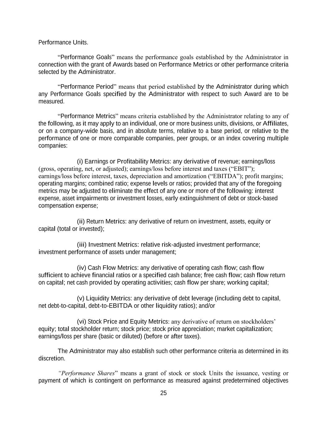 25 Performance Units. “Performance Goals” means the performance goals established by the Administrator in connection with the grant of Awards based on Performance Metrics or other performance criteria selected by the Administrator. “Performance Period” means that period established by the Administrator during which any Performance Goals specified by the Administrator with respect to such Award are to be measured. “Performance Metrics” means criteria established by the Administrator relating to any of the following, as it may apply to an individual, one or more business units, divisions, or Affiliates, or on a company-wide basis, and in absolute terms, relative to a base period, or relative to the performance of one or more comparable companies, peer groups, or an index covering multiple companies: (i) Earnings or Profitability Metrics: any derivative of revenue; earnings/loss (gross, operating, net, or adjusted); earnings/loss before interest and taxes (“EBIT”); earnings/loss before interest, taxes, depreciation and amortization (“EBITDA”); profit margins; operating margins; combined ratio; expense levels or ratios; provided that any of the foregoing metrics may be adjusted to eliminate the effect of any one or more of the following: interest expense, asset impairments or investment losses, early extinguishment of debt or stock-based compensation expense; (ii) Return Metrics: any derivative of return on investment, assets, equity or capital (total or invested); (iii) Investment Metrics: relative risk-adjusted investment performance; investment performance of assets under management; (iv) Cash Flow Metrics: any derivative of operating cash flow; cash flow sufficient to achieve financial ratios or a specified cash balance; free cash flow; cash flow return on capital; net cash provided by operating activities; cash flow per share; working capital; (v) Liquidity Metrics: any derivative of debt leverage (including debt to capital, net debt-to-capital, debt-to-EBITDA or other liquidity ratios); and/or (vi) Stock Price and Equity Metrics: any derivative of return on stockholders’ equity; total stockholder return; stock price; stock price appreciation; market capitalization; earnings/loss per share (basic or diluted) (before or after taxes). The Administrator may also establish such other performance criteria as determined in its discretion. “Performance Shares” means a grant of stock or stock Units the issuance, vesting or payment of which is contingent on performance as measured against predetermined objectives