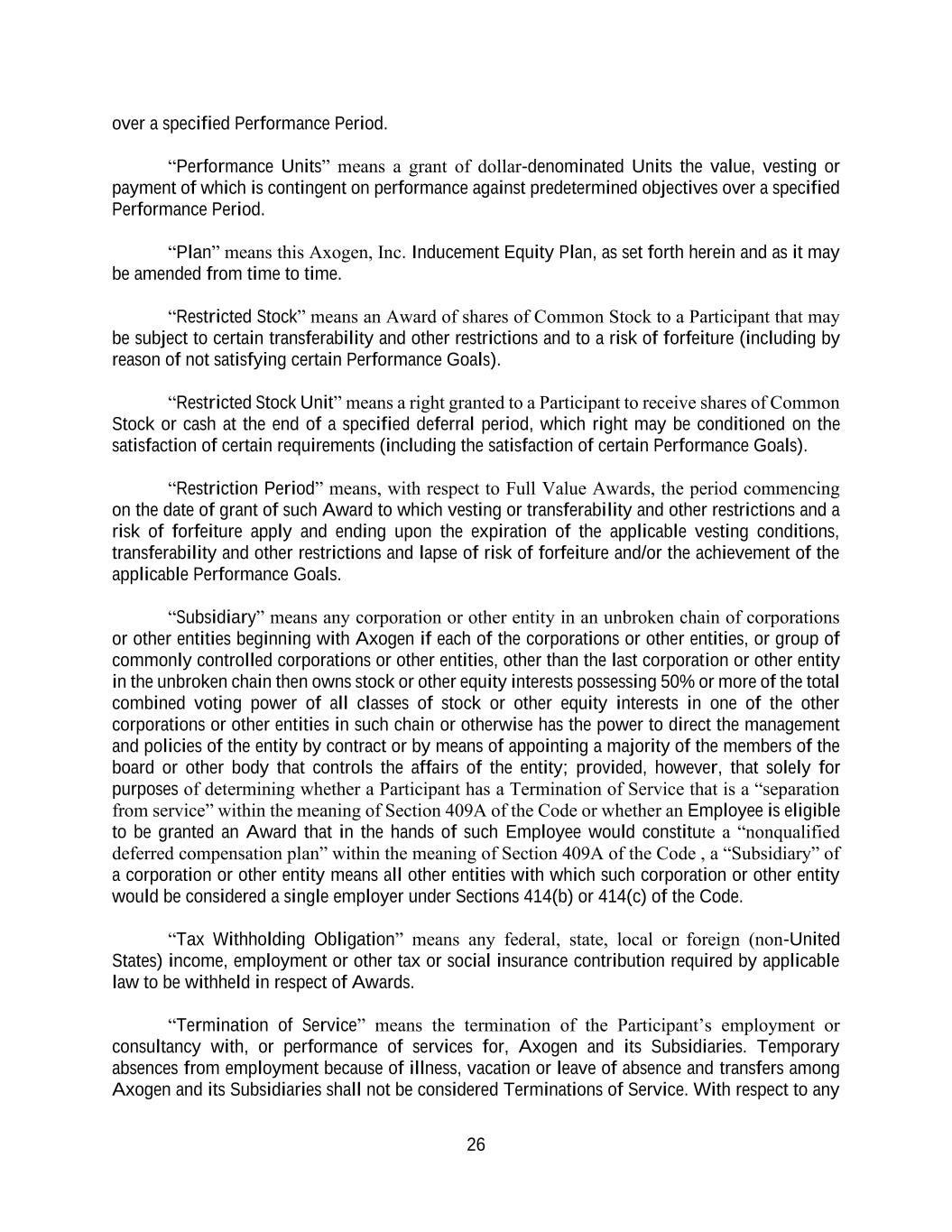 26 over a specified Performance Period. “Performance Units” means a grant of dollar-denominated Units the value, vesting or payment of which is contingent on performance against predetermined objectives over a specified Performance Period. “Plan” means this Axogen, Inc. Inducement Equity Plan, as set forth herein and as it may be amended from time to time. “Restricted Stock” means an Award of shares of Common Stock to a Participant that may be subject to certain transferability and other restrictions and to a risk of forfeiture (including by reason of not satisfying certain Performance Goals). “Restricted Stock Unit” means a right granted to a Participant to receive shares of Common Stock or cash at the end of a specified deferral period, which right may be conditioned on the satisfaction of certain requirements (including the satisfaction of certain Performance Goals). “Restriction Period” means, with respect to Full Value Awards, the period commencing on the date of grant of such Award to which vesting or transferability and other restrictions and a risk of forfeiture apply and ending upon the expiration of the applicable vesting conditions, transferability and other restrictions and lapse of risk of forfeiture and/or the achievement of the applicable Performance Goals. “Subsidiary” means any corporation or other entity in an unbroken chain of corporations or other entities beginning with Axogen if each of the corporations or other entities, or group of commonly controlled corporations or other entities, other than the last corporation or other entity in the unbroken chain then owns stock or other equity interests possessing 50% or more of the total combined voting power of all classes of stock or other equity interests in one of the other corporations or other entities in such chain or otherwise has the power to direct the management and policies of the entity by contract or by means of appointing a majority of the members of the board or other body that controls the affairs of the entity; provided, however, that solely for purposes of determining whether a Participant has a Termination of Service that is a “separation from service” within the meaning of Section 409A of the Code or whether an Employee is eligible to be granted an Award that in the hands of such Employee would constitute a “nonqualified deferred compensation plan” within the meaning of Section 409A of the Code , a “Subsidiary” of a corporation or other entity means all other entities with which such corporation or other entity would be considered a single employer under Sections 414(b) or 414(c) of the Code. “Tax Withholding Obligation” means any federal, state, local or foreign (non-United States) income, employment or other tax or social insurance contribution required by applicable law to be withheld in respect of Awards. “Termination of Service” means the termination of the Participant’s employment or consultancy with, or performance of services for, Axogen and its Subsidiaries. Temporary absences from employment because of illness, vacation or leave of absence and transfers among Axogen and its Subsidiaries shall not be considered Terminations of Service. With respect to any