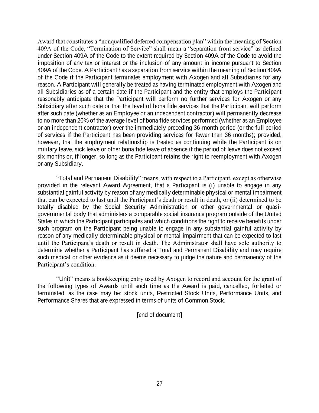 27 Award that constitutes a “nonqualified deferred compensation plan” within the meaning of Section 409A of the Code, “Termination of Service” shall mean a “separation from service” as defined under Section 409A of the Code to the extent required by Section 409A of the Code to avoid the imposition of any tax or interest or the inclusion of any amount in income pursuant to Section 409A of the Code. A Participant has a separation from service within the meaning of Section 409A of the Code if the Participant terminates employment with Axogen and all Subsidiaries for any reason. A Participant will generally be treated as having terminated employment with Axogen and all Subsidiaries as of a certain date if the Participant and the entity that employs the Participant reasonably anticipate that the Participant will perform no further services for Axogen or any Subsidiary after such date or that the level of bona fide services that the Participant will perform after such date (whether as an Employee or an independent contractor) will permanently decrease to no more than 20% of the average level of bona fide services performed (whether as an Employee or an independent contractor) over the immediately preceding 36-month period (or the full period of services if the Participant has been providing services for fewer than 36 months); provided, however, that the employment relationship is treated as continuing while the Participant is on military leave, sick leave or other bona fide leave of absence if the period of leave does not exceed six months or, if longer, so long as the Participant retains the right to reemployment with Axogen or any Subsidiary. “Total and Permanent Disability” means, with respect to a Participant, except as otherwise provided in the relevant Award Agreement, that a Participant is (i) unable to engage in any substantial gainful activity by reason of any medically determinable physical or mental impairment that can be expected to last until the Participant’s death or result in death, or (ii) determined to be totally disabled by the Social Security Administration or other governmental or quasi- governmental body that administers a comparable social insurance program outside of the United States in which the Participant participates and which conditions the right to receive benefits under such program on the Participant being unable to engage in any substantial gainful activity by reason of any medically determinable physical or mental impairment that can be expected to last until the Participant’s death or result in death. The Administrator shall have sole authority to determine whether a Participant has suffered a Total and Permanent Disability and may require such medical or other evidence as it deems necessary to judge the nature and permanency of the Participant’s condition. “Unit” means a bookkeeping entry used by Axogen to record and account for the grant of the following types of Awards until such time as the Award is paid, cancelled, forfeited or terminated, as the case may be: stock units, Restricted Stock Units, Performance Units, and Performance Shares that are expressed in terms of units of Common Stock. [end of document]