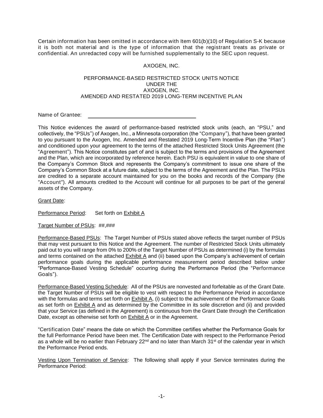 -1- Certain information has been omitted in accordance with Item 601(b)(10) of Regulation S-K because it is both not material and is the type of information that the registrant treats as private or confidential. An unredacted copy will be furnished supplementally to the SEC upon request. AXOGEN, INC. PERFORMANCE-BASED RESTRICTED STOCK UNITS NOTICE UNDER THE AXOGEN, INC. AMENDED AND RESTATED 2019 LONG-TERM INCENTIVE PLAN Name of Grantee: This Notice evidences the award of performance-based restricted stock units (each, an “PSU,” and collectively, the “PSUs”) of Axogen, Inc., a Minnesota corporation (the “Company”), that have been granted to you pursuant to the Axogen, Inc. Amended and Restated 2019 Long-Term Incentive Plan (the “Plan”) and conditioned upon your agreement to the terms of the attached Restricted Stock Units Agreement (the “Agreement”). This Notice constitutes part of and is subject to the terms and provisions of the Agreement and the Plan, which are incorporated by reference herein. Each PSU is equivalent in value to one share of the Company’s Common Stock and represents the Company’s commitment to issue one share of the Company’s Common Stock at a future date, subject to the terms of the Agreement and the Plan. The PSUs are credited to a separate account maintained for you on the books and records of the Company (the "Account"). All amounts credited to the Account will continue for all purposes to be part of the general assets of the Company. Grant Date: Performance Period: Set forth on Exhibit A Target Number of PSUs: ##,### Performance-Based PSUs: The Target Number of PSUs stated above reflects the target number of PSUs that may vest pursuant to this Notice and the Agreement. The number of Restricted Stock Units ultimately paid out to you will range from 0% to 200% of the Target Number of PSUs as determined (i) by the formulas and terms contained on the attached Exhibit A and (ii) based upon the Company’s achievement of certain performance goals during the applicable performance measurement period described below under “Performance-Based Vesting Schedule” occurring during the Performance Period (the “Performance Goals”). Performance-Based Vesting Schedule: All of the PSUs are nonvested and forfeitable as of the Grant Date. the Target Number of PSUs will be eligible to vest with respect to the Performance Period in accordance with the formulas and terms set forth on Exhibit A, (i) subject to the achievement of the Performance Goals as set forth on Exhibit A and as determined by the Committee in its sole discretion and (ii) and provided that your Service (as defined in the Agreement) is continuous from the Grant Date through the Certification Date, except as otherwise set forth on Exhibit A or in the Agreement. “Certification Date” means the date on which the Committee certifies whether the Performance Goals for the full Performance Period have been met. The Certification Date with respect to the Performance Period as a whole will be no earlier than February 22nd and no later than March 31st of the calendar year in which the Performance Period ends. Vesting Upon Termination of Service: The following shall apply if your Service terminates during the Performance Period: