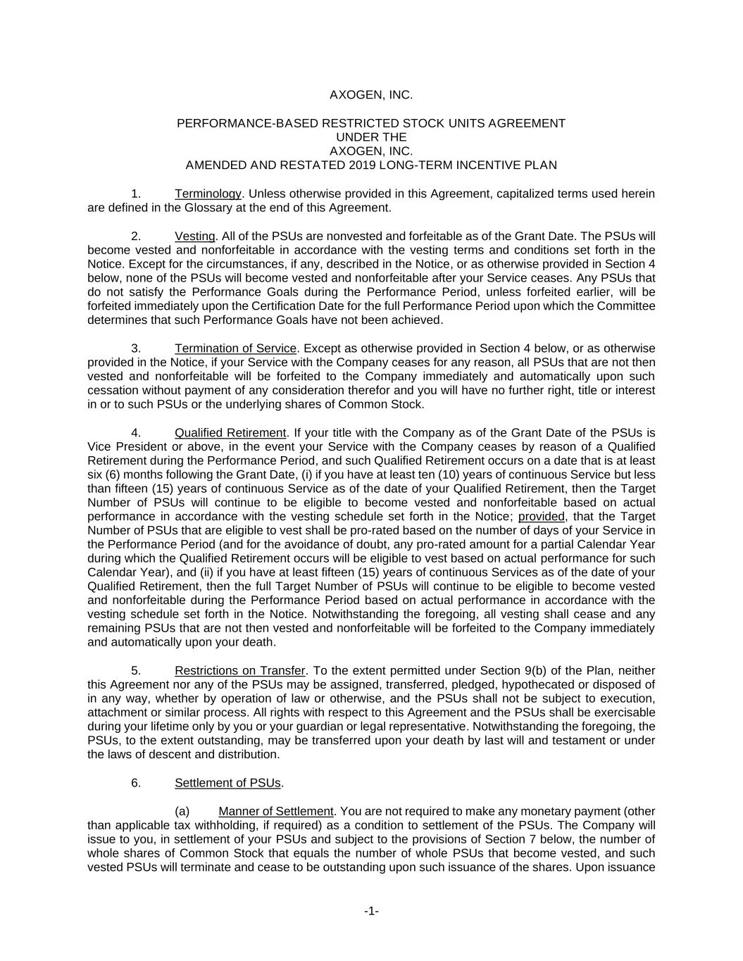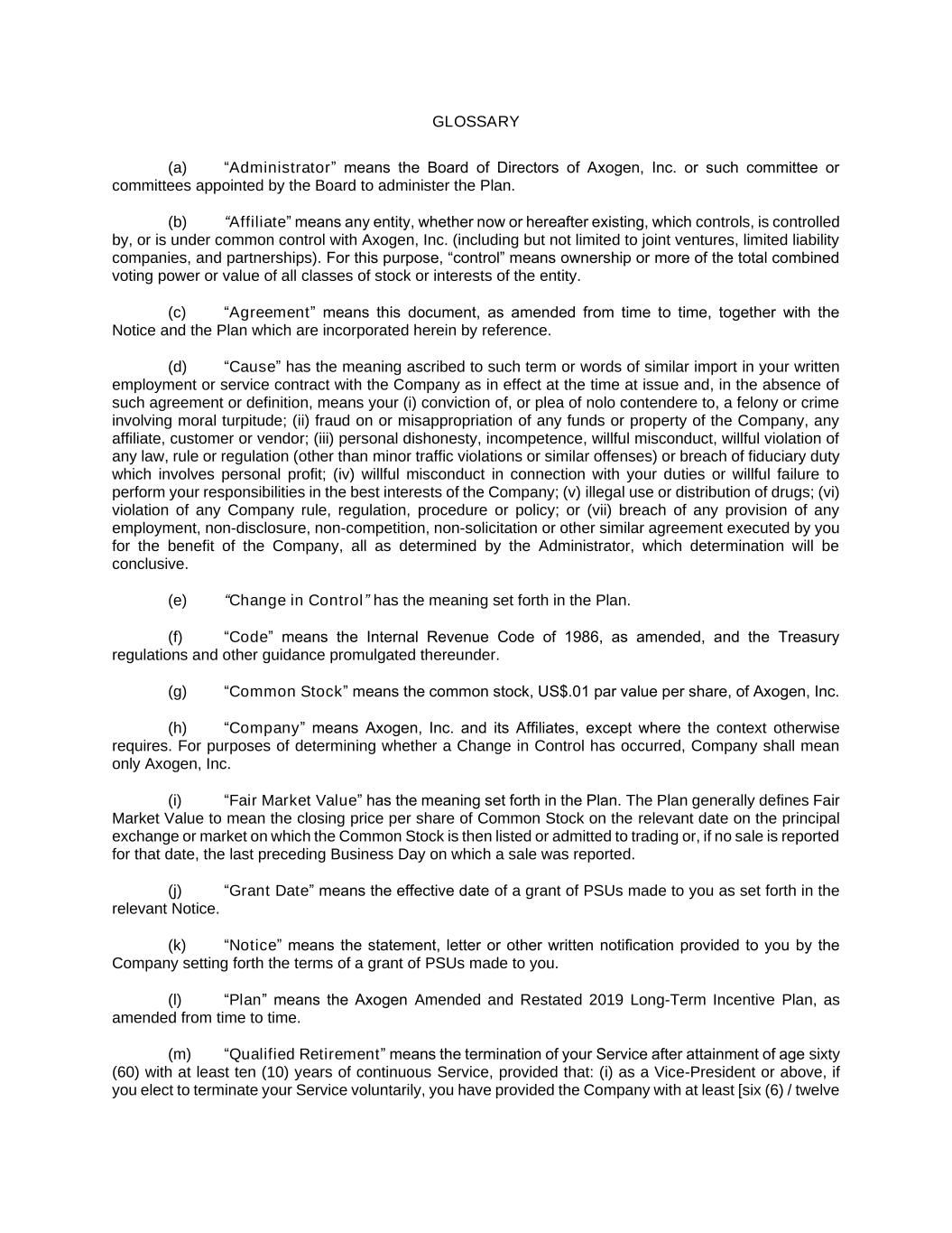 GLOSSARY (a) “Administrator” means the Board of Directors of Axogen, Inc. or such committee or committees appointed by the Board to administer the Plan. (b) “Affiliate” means any entity, whether now or hereafter existing, which controls, is controlled by, or is under common control with Axogen, Inc. (including but not limited to joint ventures, limited liability companies, and partnerships). For this purpose, “control” means ownership or more of the total combined voting power or value of all classes of stock or interests of the entity. (c) “Agreement” means this document, as amended from time to time, together with the Notice and the Plan which are incorporated herein by reference. (d) “Cause” has the meaning ascribed to such term or words of similar import in your written employment or service contract with the Company as in effect at the time at issue and, in the absence of such agreement or definition, means your (i) conviction of, or plea of nolo contendere to, a felony or crime involving moral turpitude; (ii) fraud on or misappropriation of any funds or property of the Company, any affiliate, customer or vendor; (iii) personal dishonesty, incompetence, willful misconduct, willful violation of any law, rule or regulation (other than minor traffic violations or similar offenses) or breach of fiduciary duty which involves personal profit; (iv) willful misconduct in connection with your duties or willful failure to perform your responsibilities in the best interests of the Company; (v) illegal use or distribution of drugs; (vi) violation of any Company rule, regulation, procedure or policy; or (vii) breach of any provision of any employment, non-disclosure, non-competition, non-solicitation or other similar agreement executed by you for the benefit of the Company, all as determined by the Administrator, which determination will be conclusive. (e) “Change in Control” has the meaning set forth in the Plan. (f) “Code” means the Internal Revenue Code of 1986, as amended, and the Treasury regulations and other guidance promulgated thereunder. (g) “Common Stock” means the common stock, US$.01 par value per share, of Axogen, Inc. (h) “Company” means Axogen, Inc. and its Affiliates, except where the context otherwise requires. For purposes of determining whether a Change in Control has occurred, Company shall mean only Axogen, Inc. (i) “Fair Market Value” has the meaning set forth in the Plan. The Plan generally defines Fair Market Value to mean the closing price per share of Common Stock on the relevant date on the principal exchange or market on which the Common Stock is then listed or admitted to trading or, if no sale is reported for that date, the last preceding Business Day on which a sale was reported. (j) “Grant Date” means the effective date of a grant of PSUs made to you as set forth in the relevant Notice. (k) “Notice” means the statement, letter or other written notification provided to you by the Company setting forth the terms of a grant of PSUs made to you. (l) “Plan” means the Axogen Amended and Restated 2019 Long-Term Incentive Plan, as amended from time to time. (m) “Qualified Retirement” means the termination of your Service after attainment of age sixty (60) with at least ten (10) years of continuous Service, provided that: (i) as a Vice-President or above, if you elect to terminate your Service voluntarily, you have provided the Company with at least [six (6) / twelve