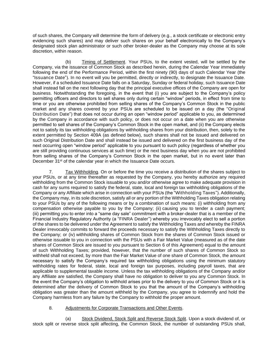 of such shares, the Company will determine the form of delivery (e.g., a stock certificate or electronic entry evidencing such shares) and may deliver such shares on your behalf electronically to the Company’s designated stock plan administrator or such other broker-dealer as the Company may choose at its sole discretion, within reason. (b) Timing of Settlement. Your PSUs, to the extent vested, will be settled by the Company, via the issuance of Common Stock as described herein, during the Calendar Year immediately following the end of the Performance Period, within the first ninety (90) days of such Calendar Year (the “Issuance Date”). In no event will you be permitted, directly or indirectly, to designate the Issuance Date. However, if a scheduled Issuance Date falls on a Saturday, Sunday or federal holiday, such Issuance Date shall instead fall on the next following day that the principal executive offices of the Company are open for business. Notwithstanding the foregoing, in the event that (i) you are subject to the Company’s policy permitting officers and directors to sell shares only during certain “window” periods, in effect from time to time or you are otherwise prohibited from selling shares of the Company’s Common Stock in the public market and any shares covered by your PSUs are scheduled to be issued on a day (the “Original Distribution Date”) that does not occur during an open “window period” applicable to you, as determined by the Company in accordance with such policy, or does not occur on a date when you are otherwise permitted to sell shares of the Company’s Common Stock in the open market, and (ii) the Company elects not to satisfy its tax withholding obligations by withholding shares from your distribution, then, solely to the extent permitted by Section 409A (as defined below), such shares shall not be issued and delivered on such Original Distribution Date and shall instead be issued and delivered on the first business day of the next occurring open “window period” applicable to you pursuant to such policy (regardless of whether you are still providing continuous services at such time) or the next business day when you are not prohibited from selling shares of the Company’s Common Stock in the open market, but in no event later than December 31st of the calendar year in which the Issuance Date occurs. 7. Tax Withholding. On or before the time you receive a distribution of the shares subject to your PSUs, or at any time thereafter as requested by the Company, you hereby authorize any required withholding from the Common Stock issuable to you and/or otherwise agree to make adequate provision in cash for any sums required to satisfy the federal, state, local and foreign tax withholding obligations of the Company or any Affiliate which arise in connection with your PSUs (the “Withholding Taxes”). Additionally, the Company may, in its sole discretion, satisfy all or any portion of the Withholding Taxes obligation relating to your PSUs by any of the following means or by a combination of such means: (i) withholding from any compensation otherwise payable to you by the Company; (ii) causing you to tender a cash payment; (iii) permitting you to enter into a “same day sale” commitment with a broker-dealer that is a member of the Financial Industry Regulatory Authority (a “FINRA Dealer”) whereby you irrevocably elect to sell a portion of the shares to be delivered under the Agreement to satisfy the Withholding Taxes and whereby the FINRA Dealer irrevocably commits to forward the proceeds necessary to satisfy the Withholding Taxes directly to the Company; or (iv) withholding shares of Common Stock from the shares of Common Stock issued or otherwise issuable to you in connection with the PSUs with a Fair Market Value (measured as of the date shares of Common Stock are issued to you pursuant to Section 6 of this Agreement) equal to the amount of such Withholding Taxes; provided, however, that the number of such shares of Common Stock so withheld shall not exceed, by more than the Fair Market Value of one share of Common Stock, the amount necessary to satisfy the Company’s required tax withholding obligations using the minimum statutory withholding rates for federal, state, local and foreign tax purposes, including payroll taxes, that are applicable to supplemental taxable income. Unless the tax withholding obligations of the Company and/or any Affiliate are satisfied, the Company shall have no obligation to deliver to you any Common Stock. In the event the Company’s obligation to withhold arises prior to the delivery to you of Common Stock or it is determined after the delivery of Common Stock to you that the amount of the Company’s withholding obligation was greater than the amount withheld by the Company, you agree to indemnify and hold the Company harmless from any failure by the Company to withhold the proper amount. 8. Adjustments for Corporate Transactions and Other Events. (a) Stock Dividend, Stock Split and Reverse Stock Split. Upon a stock dividend of, or stock split or reverse stock split affecting, the Common Stock, the number of outstanding PSUs shall,