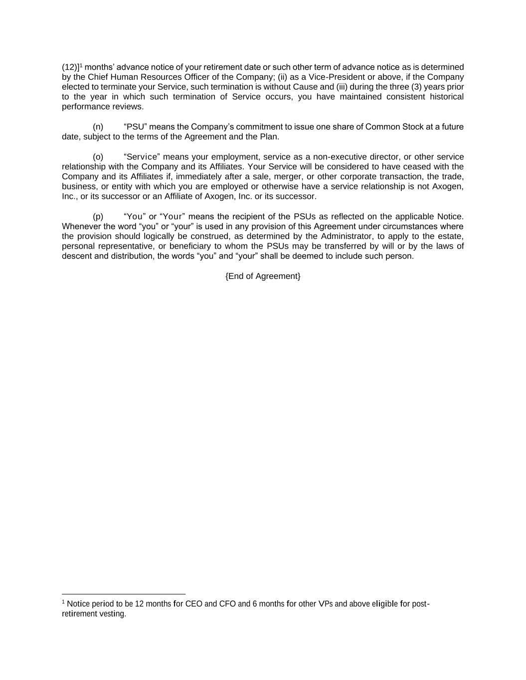 (12)]1 months’ advance notice of your retirement date or such other term of advance notice as is determined by the Chief Human Resources Officer of the Company; (ii) as a Vice-President or above, if the Company elected to terminate your Service, such termination is without Cause and (iii) during the three (3) years prior to the year in which such termination of Service occurs, you have maintained consistent historical performance reviews. (n) “PSU” means the Company’s commitment to issue one share of Common Stock at a future date, subject to the terms of the Agreement and the Plan. (o) “Service” means your employment, service as a non-executive director, or other service relationship with the Company and its Affiliates. Your Service will be considered to have ceased with the Company and its Affiliates if, immediately after a sale, merger, or other corporate transaction, the trade, business, or entity with which you are employed or otherwise have a service relationship is not Axogen, Inc., or its successor or an Affiliate of Axogen, Inc. or its successor. (p) “You” or “Your” means the recipient of the PSUs as reflected on the applicable Notice. Whenever the word “you” or “your” is used in any provision of this Agreement under circumstances where the provision should logically be construed, as determined by the Administrator, to apply to the estate, personal representative, or beneficiary to whom the PSUs may be transferred by will or by the laws of descent and distribution, the words “you” and “your” shall be deemed to include such person. {End of Agreement} 1 Notice period to be 12 months for CEO and CFO and 6 months for other VPs and above eligible for post- retirement vesting.