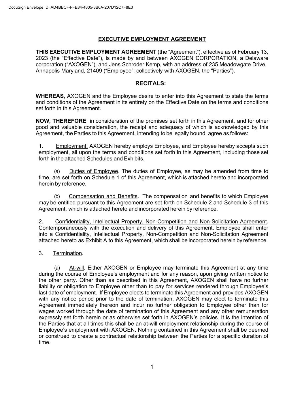 1 EXECUTIVE EMPLOYMENT AGREEMENT THIS EXECUTIVE EMPLOYMENT AGREEMENT (the “Agreement”), effective as of February 13, 2023 (the “Effective Date”), is made by and between AXOGEN CORPORATION, a Delaware corporation (“AXOGEN”), and Jens Schroder Kemp, with an address of 235 Meadowgate Drive, Annapolis Maryland, 21409 (“Employee”; collectively with AXOGEN, the “Parties”). RECITALS: WHEREAS, AXOGEN and the Employee desire to enter into this Agreement to state the terms and conditions of the Agreement in its entirety on the Effective Date on the terms and conditions set forth in this Agreement. NOW, THEREFORE, in consideration of the promises set forth in this Agreement, and for other good and valuable consideration, the receipt and adequacy of which is acknowledged by this Agreement, the Parties to this Agreement, intending to be legally bound, agree as follows: 1. Employment. AXOGEN hereby employs Employee, and Employee hereby accepts such employment, all upon the terms and conditions set forth in this Agreement, including those set forth in the attached Schedules and Exhibits. (a) Duties of Employee. The duties of Employee, as may be amended from time to time, are set forth on Schedule 1 of this Agreement, which is attached hereto and incorporated herein by reference. (b) Compensation and Benefits. The compensation and benefits to which Employee may be entitled pursuant to this Agreement are set forth on Schedule 2 and Schedule 3 of this Agreement, which is attached hereto and incorporated herein by reference. 2. Confidentiality, Intellectual Property, Non-Competition and Non-Solicitation Agreement. Contemporaneously with the execution and delivery of this Agreement, Employee shall enter into a Confidentiality, Intellectual Property, Non-Competition and Non-Solicitation Agreement attached hereto as Exhibit A to this Agreement, which shall be incorporated herein by reference. 3. Termination. (a) At-will. Either AXOGEN or Employee may terminate this Agreement at any time during the course of Employee’s employment and for any reason, upon giving written notice to the other party. Other than as described in this Agreement, AXOGEN shall have no further liability or obligation to Employee other than to pay for services rendered through Employee’s last date of employment. If Employee elects to terminate this Agreement and provides AXOGEN with any notice period prior to the date of termination, AXOGEN may elect to terminate this Agreement immediately thereon and incur no further obligation to Employee other than for wages worked through the date of termination of this Agreement and any other remuneration expressly set forth herein or as otherwise set forth in AXOGEN’s policies. It is the intention of the Parties that at all times this shall be an at-will employment relationship during the course of Employee’s employment with AXOGEN. Nothing contained in this Agreement shall be deemed or construed to create a contractual relationship between the Parties for a specific duration of time. DocuSign Envelope ID: AD4BBCF4-FE84-4805-8B6A-207D12C7F8E3