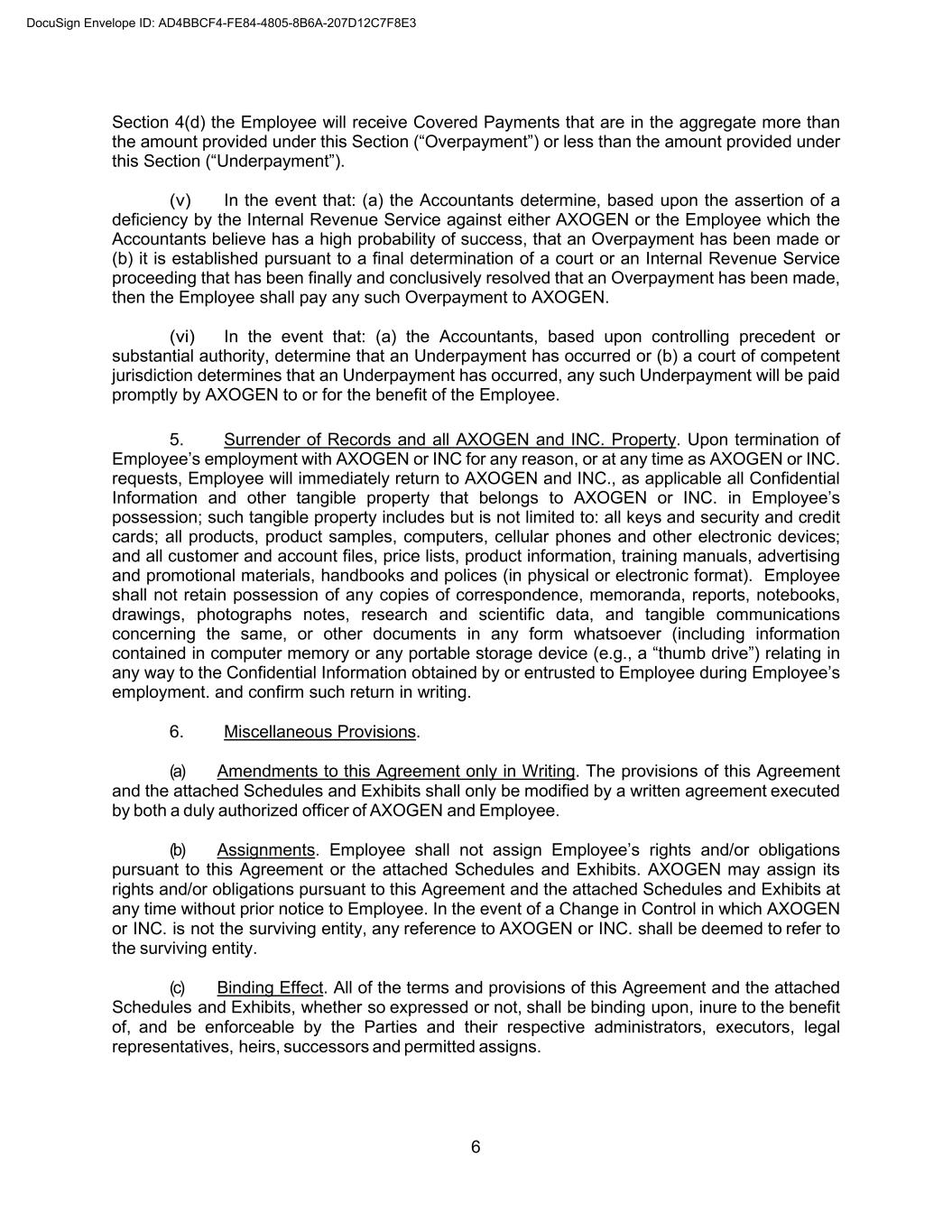 6 Section 4(d) the Employee will receive Covered Payments that are in the aggregate more than the amount provided under this Section (“Overpayment”) or less than the amount provided under this Section (“Underpayment”). (v) In the event that: (a) the Accountants determine, based upon the assertion of a deficiency by the Internal Revenue Service against either AXOGEN or the Employee which the Accountants believe has a high probability of success, that an Overpayment has been made or (b) it is established pursuant to a final determination of a court or an Internal Revenue Service proceeding that has been finally and conclusively resolved that an Overpayment has been made, then the Employee shall pay any such Overpayment to AXOGEN. (vi) In the event that: (a) the Accountants, based upon controlling precedent or substantial authority, determine that an Underpayment has occurred or (b) a court of competent jurisdiction determines that an Underpayment has occurred, any such Underpayment will be paid promptly by AXOGEN to or for the benefit of the Employee. 5. Surrender of Records and all AXOGEN and INC. Property. Upon termination of Employee’s employment with AXOGEN or INC for any reason, or at any time as AXOGEN or INC. requests, Employee will immediately return to AXOGEN and INC., as applicable all Confidential Information and other tangible property that belongs to AXOGEN or INC. in Employee’s possession; such tangible property includes but is not limited to: all keys and security and credit cards; all products, product samples, computers, cellular phones and other electronic devices; and all customer and account files, price lists, product information, training manuals, advertising and promotional materials, handbooks and polices (in physical or electronic format). Employee shall not retain possession of any copies of correspondence, memoranda, reports, notebooks, drawings, photographs notes, research and scientific data, and tangible communications concerning the same, or other documents in any form whatsoever (including information contained in computer memory or any portable storage device (e.g., a “thumb drive”) relating in any way to the Confidential Information obtained by or entrusted to Employee during Employee’s employment. and confirm such return in writing. 6. Miscellaneous Provisions. (a) Amendments to this Agreement only in Writing. The provisions of this Agreement and the attached Schedules and Exhibits shall only be modified by a written agreement executed by both a duly authorized officer of AXOGEN and Employee. (b) Assignments. Employee shall not assign Employee’s rights and/or obligations pursuant to this Agreement or the attached Schedules and Exhibits. AXOGEN may assign its rights and/or obligations pursuant to this Agreement and the attached Schedules and Exhibits at any time without prior notice to Employee. In the event of a Change in Control in which AXOGEN or INC. is not the surviving entity, any reference to AXOGEN or INC. shall be deemed to refer to the surviving entity. (c) Binding Effect. All of the terms and provisions of this Agreement and the attached Schedules and Exhibits, whether so expressed or not, shall be binding upon, inure to the benefit of, and be enforceable by the Parties and their respective administrators, executors, legal representatives, heirs, successors and permitted assigns. DocuSign Envelope ID: AD4BBCF4-FE84-4805-8B6A-207D12C7F8E3