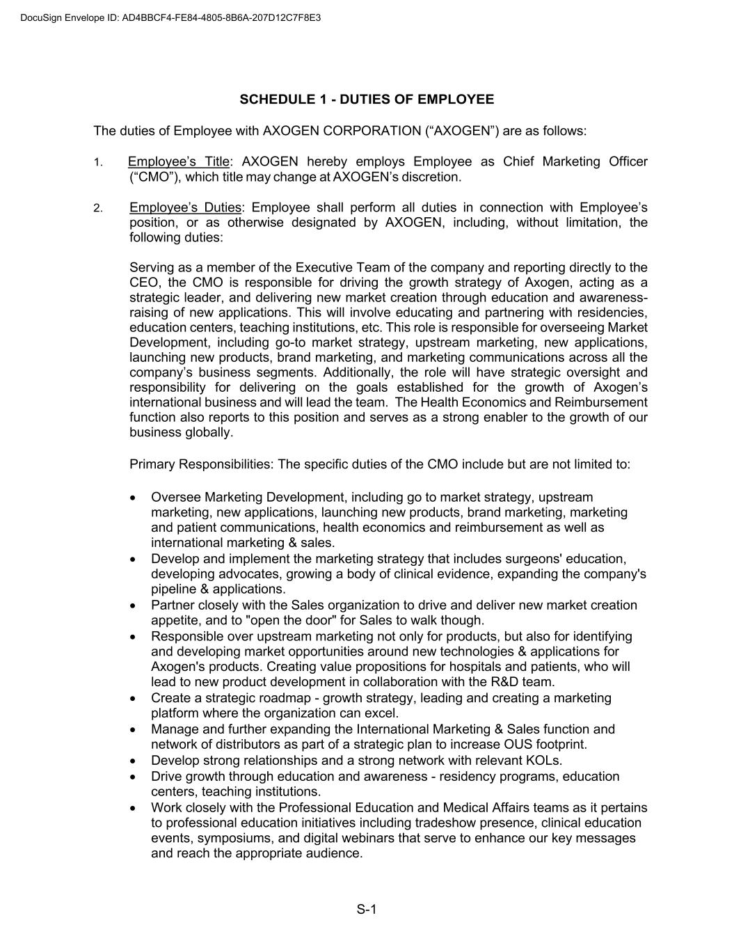 S-1 SCHEDULE 1 - DUTIES OF EMPLOYEE The duties of Employee with AXOGEN CORPORATION (“AXOGEN”) are as follows: 1. Employee’s Title: AXOGEN hereby employs Employee as Chief Marketing Officer (“CMO”), which title may change at AXOGEN’s discretion. 2. Employee’s Duties: Employee shall perform all duties in connection with Employee’s position, or as otherwise designated by AXOGEN, including, without limitation, the following duties: Serving as a member of the Executive Team of the company and reporting directly to the CEO, the CMO is responsible for driving the growth strategy of Axogen, acting as a strategic leader, and delivering new market creation through education and awareness- raising of new applications. This will involve educating and partnering with residencies, education centers, teaching institutions, etc. This role is responsible for overseeing Market Development, including go-to market strategy, upstream marketing, new applications, launching new products, brand marketing, and marketing communications across all the company’s business segments. Additionally, the role will have strategic oversight and responsibility for delivering on the goals established for the growth of Axogen’s international business and will lead the team. The Health Economics and Reimbursement function also reports to this position and serves as a strong enabler to the growth of our business globally. Primary Responsibilities: The specific duties of the CMO include but are not limited to: • Oversee Marketing Development, including go to market strategy, upstream marketing, new applications, launching new products, brand marketing, marketing and patient communications, health economics and reimbursement as well as international marketing & sales. • Develop and implement the marketing strategy that includes surgeons' education, developing advocates, growing a body of clinical evidence, expanding the company's pipeline & applications. • Partner closely with the Sales organization to drive and deliver new market creation appetite, and to "open the door" for Sales to walk though. • Responsible over upstream marketing not only for products, but also for identifying and developing market opportunities around new technologies & applications for Axogen's products. Creating value propositions for hospitals and patients, who will lead to new product development in collaboration with the R&D team. • Create a strategic roadmap - growth strategy, leading and creating a marketing platform where the organization can excel. • Manage and further expanding the International Marketing & Sales function and network of distributors as part of a strategic plan to increase OUS footprint. • Develop strong relationships and a strong network with relevant KOLs. • Drive growth through education and awareness - residency programs, education centers, teaching institutions. • Work closely with the Professional Education and Medical Affairs teams as it pertains to professional education initiatives including tradeshow presence, clinical education events, symposiums, and digital webinars that serve to enhance our key messages and reach the appropriate audience. DocuSign Envelope ID: AD4BBCF4-FE84-4805-8B6A-207D12C7F8E3