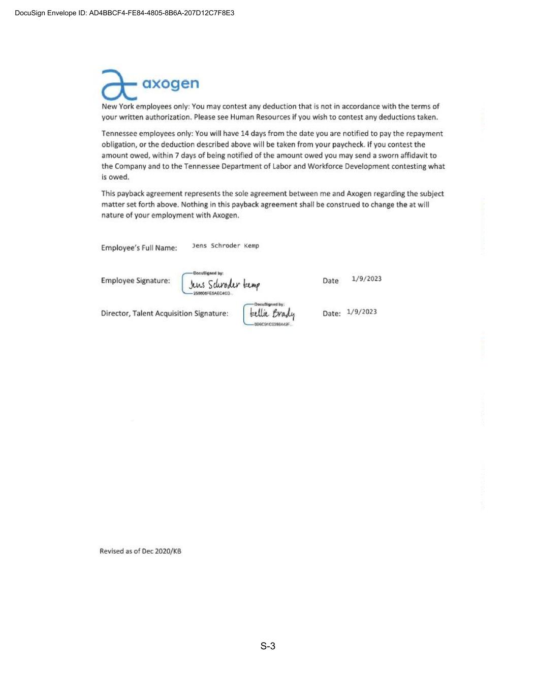 S-2 (b) Payment. The Bonus if paid shall be paid in accordance with, and subject to, the normal payroll policies of AXOGEN with respect to similar forms of compensation, including, without limitation, being subject to all appropriate withholding taxes. 6. Compensation Review. AXOGEN may, from time to time, review Employee’s compensation (including benefits) and may, in its sole discretion, increase, or decrease, or eliminate any or all of the benefits. Any such increase or decrease in the compensation package shall be in writing, executed by a duly authorized officer of AXOGEN, and such writing shall constitute an amendment to this Paragraph 6 (and to the Agreement and any applicable Schedules or Exhibits) solely as to the benefits, without waiver or modification of any other terms, conditions or provisions of the Agreement. 7. No Other Compensation. Employee agrees that the compensation and benefits set forth in the Agreement, this Schedule 2 and Schedule 3 contain the sole and exclusive compensation and benefits to which Employee is eligible and that Employee shall have no rights to receive any other compensation or benefits of any nature from AXOGEN. Notwithstanding the foregoing, any and all equity awards granted to the Employee remain in full force under the terms upon which they were originally granted. DocuSign Envelope ID: AD4BBCF4-FE84-4805-8B6A-207D12C7F8E3