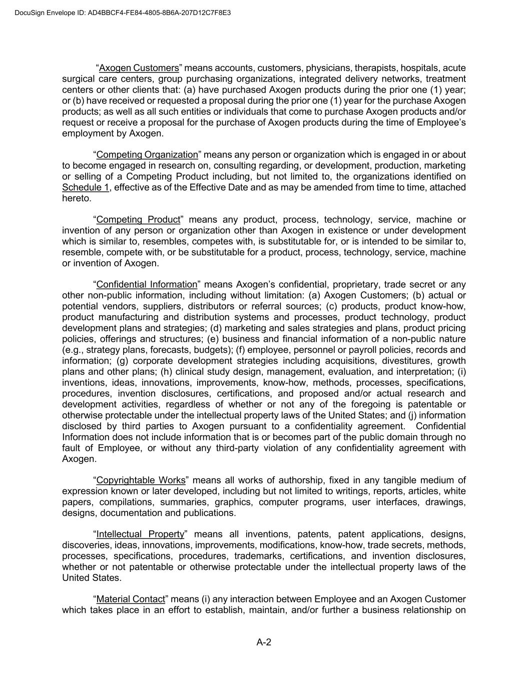 A-2 “Axogen Customers” means accounts, customers, physicians, therapists, hospitals, acute surgical care centers, group purchasing organizations, integrated delivery networks, treatment centers or other clients that: (a) have purchased Axogen products during the prior one (1) year; or (b) have received or requested a proposal during the prior one (1) year for the purchase Axogen products; as well as all such entities or individuals that come to purchase Axogen products and/or request or receive a proposal for the purchase of Axogen products during the time of Employee’s employment by Axogen. “Competing Organization” means any person or organization which is engaged in or about to become engaged in research on, consulting regarding, or development, production, marketing or selling of a Competing Product including, but not limited to, the organizations identified on Schedule 1, effective as of the Effective Date and as may be amended from time to time, attached hereto. “Competing Product” means any product, process, technology, service, machine or invention of any person or organization other than Axogen in existence or under development which is similar to, resembles, competes with, is substitutable for, or is intended to be similar to, resemble, compete with, or be substitutable for a product, process, technology, service, machine or invention of Axogen. “Confidential Information” means Axogen’s confidential, proprietary, trade secret or any other non-public information, including without limitation: (a) Axogen Customers; (b) actual or potential vendors, suppliers, distributors or referral sources; (c) products, product know-how, product manufacturing and distribution systems and processes, product technology, product development plans and strategies; (d) marketing and sales strategies and plans, product pricing policies, offerings and structures; (e) business and financial information of a non-public nature (e.g., strategy plans, forecasts, budgets); (f) employee, personnel or payroll policies, records and information; (g) corporate development strategies including acquisitions, divestitures, growth plans and other plans; (h) clinical study design, management, evaluation, and interpretation; (i) inventions, ideas, innovations, improvements, know-how, methods, processes, specifications, procedures, invention disclosures, certifications, and proposed and/or actual research and development activities, regardless of whether or not any of the foregoing is patentable or otherwise protectable under the intellectual property laws of the United States; and (j) information disclosed by third parties to Axogen pursuant to a confidentiality agreement. Confidential Information does not include information that is or becomes part of the public domain through no fault of Employee, or without any third-party violation of any confidentiality agreement with Axogen. “Copyrightable Works” means all works of authorship, fixed in any tangible medium of expression known or later developed, including but not limited to writings, reports, articles, white papers, compilations, summaries, graphics, computer programs, user interfaces, drawings, designs, documentation and publications. “Intellectual Property” means all inventions, patents, patent applications, designs, discoveries, ideas, innovations, improvements, modifications, know-how, trade secrets, methods, processes, specifications, procedures, trademarks, certifications, and invention disclosures, whether or not patentable or otherwise protectable under the intellectual property laws of the United States. “Material Contact” means (i) any interaction between Employee and an Axogen Customer which takes place in an effort to establish, maintain, and/or further a business relationship on DocuSign Envelope ID: AD4BBCF4-FE84-4805-8B6A-207D12C7F8E3