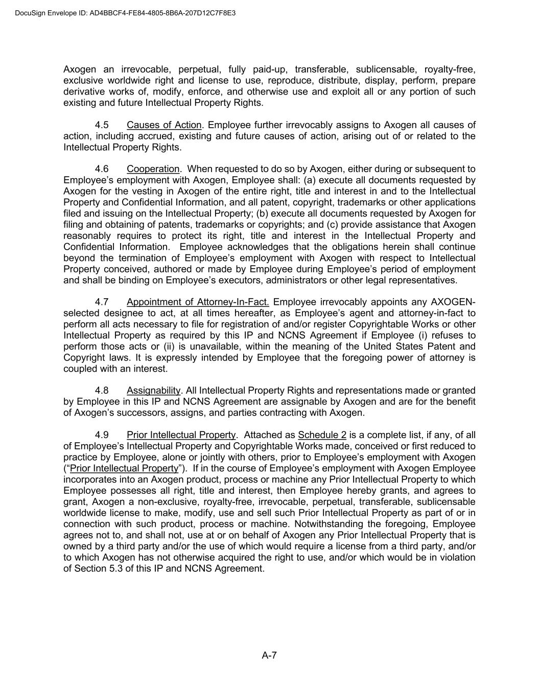 A-7 Axogen an irrevocable, perpetual, fully paid-up, transferable, sublicensable, royalty-free, exclusive worldwide right and license to use, reproduce, distribute, display, perform, prepare derivative works of, modify, enforce, and otherwise use and exploit all or any portion of such existing and future Intellectual Property Rights. 4.5 Causes of Action. Employee further irrevocably assigns to Axogen all causes of action, including accrued, existing and future causes of action, arising out of or related to the Intellectual Property Rights. 4.6 Cooperation. When requested to do so by Axogen, either during or subsequent to Employee’s employment with Axogen, Employee shall: (a) execute all documents requested by Axogen for the vesting in Axogen of the entire right, title and interest in and to the Intellectual Property and Confidential Information, and all patent, copyright, trademarks or other applications filed and issuing on the Intellectual Property; (b) execute all documents requested by Axogen for filing and obtaining of patents, trademarks or copyrights; and (c) provide assistance that Axogen reasonably requires to protect its right, title and interest in the Intellectual Property and Confidential Information. Employee acknowledges that the obligations herein shall continue beyond the termination of Employee’s employment with Axogen with respect to Intellectual Property conceived, authored or made by Employee during Employee’s period of employment and shall be binding on Employee’s executors, administrators or other legal representatives. 4.7 Appointment of Attorney-In-Fact. Employee irrevocably appoints any AXOGEN- selected designee to act, at all times hereafter, as Employee’s agent and attorney-in-fact to perform all acts necessary to file for registration of and/or register Copyrightable Works or other Intellectual Property as required by this IP and NCNS Agreement if Employee (i) refuses to perform those acts or (ii) is unavailable, within the meaning of the United States Patent and Copyright laws. It is expressly intended by Employee that the foregoing power of attorney is coupled with an interest. 4.8 Assignability. All Intellectual Property Rights and representations made or granted by Employee in this IP and NCNS Agreement are assignable by Axogen and are for the benefit of Axogen’s successors, assigns, and parties contracting with Axogen. 4.9 Prior Intellectual Property. Attached as Schedule 2 is a complete list, if any, of all of Employee’s Intellectual Property and Copyrightable Works made, conceived or first reduced to practice by Employee, alone or jointly with others, prior to Employee’s employment with Axogen (“Prior Intellectual Property”). If in the course of Employee’s employment with Axogen Employee incorporates into an Axogen product, process or machine any Prior Intellectual Property to which Employee possesses all right, title and interest, then Employee hereby grants, and agrees to grant, Axogen a non-exclusive, royalty-free, irrevocable, perpetual, transferable, sublicensable worldwide license to make, modify, use and sell such Prior Intellectual Property as part of or in connection with such product, process or machine. Notwithstanding the foregoing, Employee agrees not to, and shall not, use at or on behalf of Axogen any Prior Intellectual Property that is owned by a third party and/or the use of which would require a license from a third party, and/or to which Axogen has not otherwise acquired the right to use, and/or which would be in violation of Section 5.3 of this IP and NCNS Agreement. DocuSign Envelope ID: AD4BBCF4-FE84-4805-8B6A-207D12C7F8E3