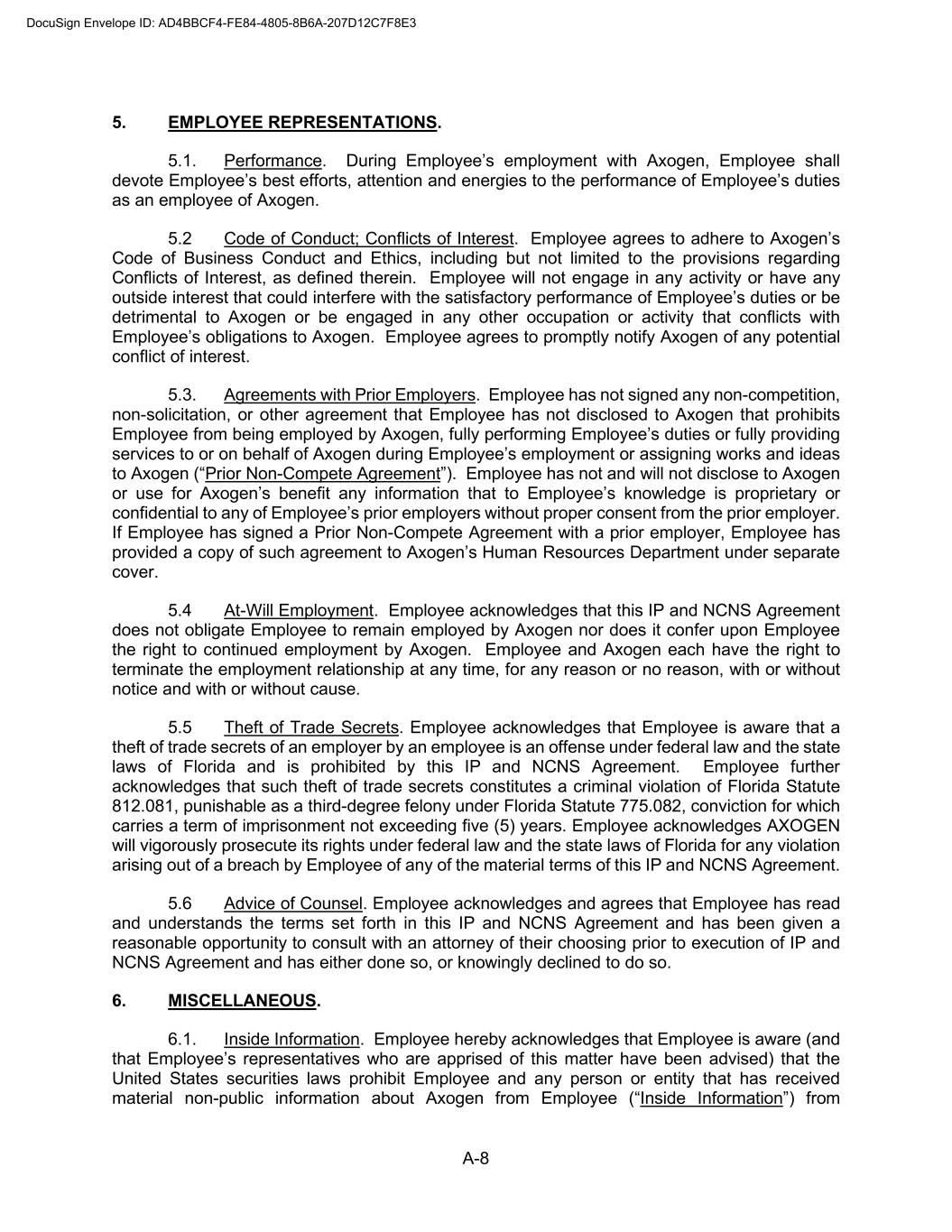 A-8 5. EMPLOYEE REPRESENTATIONS. 5.1. Performance. During Employee’s employment with Axogen, Employee shall devote Employee’s best efforts, attention and energies to the performance of Employee’s duties as an employee of Axogen. 5.2 Code of Conduct; Conflicts of Interest. Employee agrees to adhere to Axogen’s Code of Business Conduct and Ethics, including but not limited to the provisions regarding Conflicts of Interest, as defined therein. Employee will not engage in any activity or have any outside interest that could interfere with the satisfactory performance of Employee’s duties or be detrimental to Axogen or be engaged in any other occupation or activity that conflicts with Employee’s obligations to Axogen. Employee agrees to promptly notify Axogen of any potential conflict of interest. 5.3. Agreements with Prior Employers. Employee has not signed any non-competition, non-solicitation, or other agreement that Employee has not disclosed to Axogen that prohibits Employee from being employed by Axogen, fully performing Employee’s duties or fully providing services to or on behalf of Axogen during Employee’s employment or assigning works and ideas to Axogen (“Prior Non-Compete Agreement”). Employee has not and will not disclose to Axogen or use for Axogen’s benefit any information that to Employee’s knowledge is proprietary or confidential to any of Employee’s prior employers without proper consent from the prior employer. If Employee has signed a Prior Non-Compete Agreement with a prior employer, Employee has provided a copy of such agreement to Axogen’s Human Resources Department under separate cover. 5.4 At-Will Employment. Employee acknowledges that this IP and NCNS Agreement does not obligate Employee to remain employed by Axogen nor does it confer upon Employee the right to continued employment by Axogen. Employee and Axogen each have the right to terminate the employment relationship at any time, for any reason or no reason, with or without notice and with or without cause. 5.5 Theft of Trade Secrets. Employee acknowledges that Employee is aware that a theft of trade secrets of an employer by an employee is an offense under federal law and the state laws of Florida and is prohibited by this IP and NCNS Agreement. Employee further acknowledges that such theft of trade secrets constitutes a criminal violation of Florida Statute 812.081, punishable as a third-degree felony under Florida Statute 775.082, conviction for which carries a term of imprisonment not exceeding five (5) years. Employee acknowledges AXOGEN will vigorously prosecute its rights under federal law and the state laws of Florida for any violation arising out of a breach by Employee of any of the material terms of this IP and NCNS Agreement. 5.6 Advice of Counsel. Employee acknowledges and agrees that Employee has read and understands the terms set forth in this IP and NCNS Agreement and has been given a reasonable opportunity to consult with an attorney of their choosing prior to execution of IP and NCNS Agreement and has either done so, or knowingly declined to do so. 6. MISCELLANEOUS. 6.1. Inside Information. Employee hereby acknowledges that Employee is aware (and that Employee’s representatives who are apprised of this matter have been advised) that the United States securities laws prohibit Employee and any person or entity that has received material non-public information about Axogen from Employee (“Inside Information”) from DocuSign Envelope ID: AD4BBCF4-FE84-4805-8B6A-207D12C7F8E3