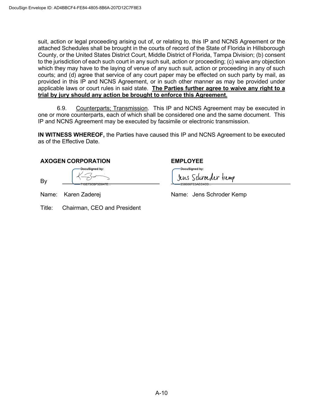 A-10 suit, action or legal proceeding arising out of, or relating to, this IP and NCNS Agreement or the attached Schedules shall be brought in the courts of record of the State of Florida in Hillsborough County, or the United States District Court, Middle District of Florida, Tampa Division; (b) consent to the jurisdiction of each such court in any such suit, action or proceeding; (c) waive any objection which they may have to the laying of venue of any such suit, action or proceeding in any of such courts; and (d) agree that service of any court paper may be effected on such party by mail, as provided in this IP and NCNS Agreement, or in such other manner as may be provided under applicable laws or court rules in said state. The Parties further agree to waive any right to a trial by jury should any action be brought to enforce this Agreement. 6.9. Counterparts; Transmission. This IP and NCNS Agreement may be executed in one or more counterparts, each of which shall be considered one and the same document. This IP and NCNS Agreement may be executed by facsimile or electronic transmission. IN WITNESS WHEREOF, the Parties have caused this IP and NCNS Agreement to be executed as of the Effective Date. AXOGEN CORPORATION By Name: Karen Zaderej Title: Chairman, CEO and President EMPLOYEE _____________________________________ Name: Jens Schroder Kemp DocuSign Envelope ID: AD4BBCF4-FE84-4805-8B6A-207D12C7F8E3