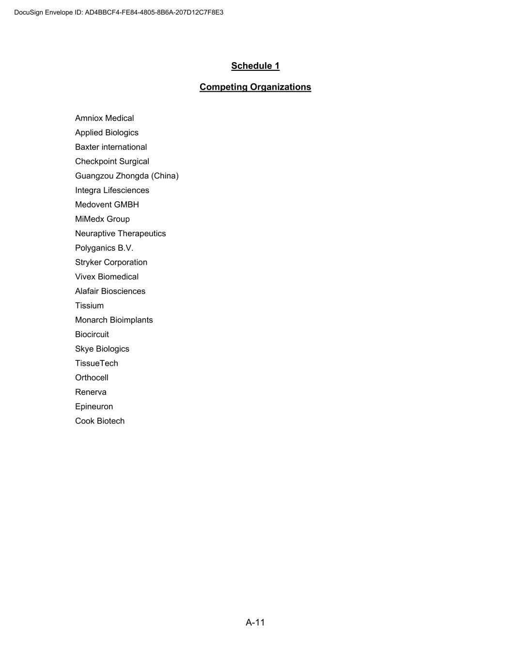 A-11 Schedule 1 Competing Organizations Amniox Medical Applied Biologics Baxter international Checkpoint Surgical Guangzou Zhongda (China) Integra Lifesciences Medovent GMBH MiMedx Group Neuraptive Therapeutics Polyganics B.V. Stryker Corporation Vivex Biomedical Alafair Biosciences Tissium Monarch Bioimplants Biocircuit Skye Biologics TissueTech Orthocell Renerva Epineuron Cook Biotech DocuSign Envelope ID: AD4BBCF4-FE84-4805-8B6A-207D12C7F8E3