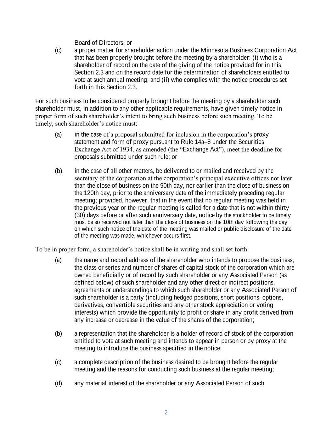 2 Board of Directors; or (c) a proper matter for shareholder action under the Minnesota Business Corporation Act that has been properly brought before the meeting by a shareholder: (i) who is a shareholder of record on the date of the giving of the notice provided for in this Section 2.3 and on the record date for the determination of shareholders entitled to vote at such annual meeting; and (ii) who complies with the notice procedures set forth in this Section 2.3. For such business to be considered properly brought before the meeting by a shareholder such shareholder must, in addition to any other applicable requirements, have given timely notice in proper form of such shareholder’s intent to bring such business before such meeting. To be timely, such shareholder’s notice must: (a) in the case of a proposal submitted for inclusion in the corporation’s proxy statement and form of proxy pursuant to Rule 14a–8 under the Securities Exchange Act of 1934, as amended (the “Exchange Act”), meet the deadline for proposals submitted under such rule; or (b) in the case of all other matters, be delivered to or mailed and received by the secretary of the corporation at the corporation’s principal executive offices not later than the close of business on the 90th day, nor earlier than the close of business on the 120th day, prior to the anniversary date of the immediately preceding regular meeting; provided, however, that in the event that no regular meeting was held in the previous year or the regular meeting is called for a date that is not within thirty (30) days before or after such anniversary date, notice by the stockholder to be timely must be so received not later than the close of business on the 10th day following the day on which such notice of the date of the meeting was mailed or public disclosure of the date of the meeting was made, whichever occurs first. To be in proper form, a shareholder’s notice shall be in writing and shall set forth: (a) the name and record address of the shareholder who intends to propose the business, the class or series and number of shares of capital stock of the corporation which are owned beneficially or of record by such shareholder or any Associated Person (as defined below) of such shareholder and any other direct or indirect positions, agreements or understandings to which such shareholder or any Associated Person of such shareholder is a party (including hedged positions, short positions, options, derivatives, convertible securities and any other stock appreciation or voting interests) which provide the opportunity to profit or share in any profit derived from any increase or decrease in the value of the shares of the corporation; (b) a representation that the shareholder is a holder of record of stock of the corporation entitled to vote at such meeting and intends to appear in person or by proxy at the meeting to introduce the business specified in the notice; (c) a complete description of the business desired to be brought before the regular meeting and the reasons for conducting such business at the regular meeting; (d) any material interest of the shareholder or any Associated Person of such