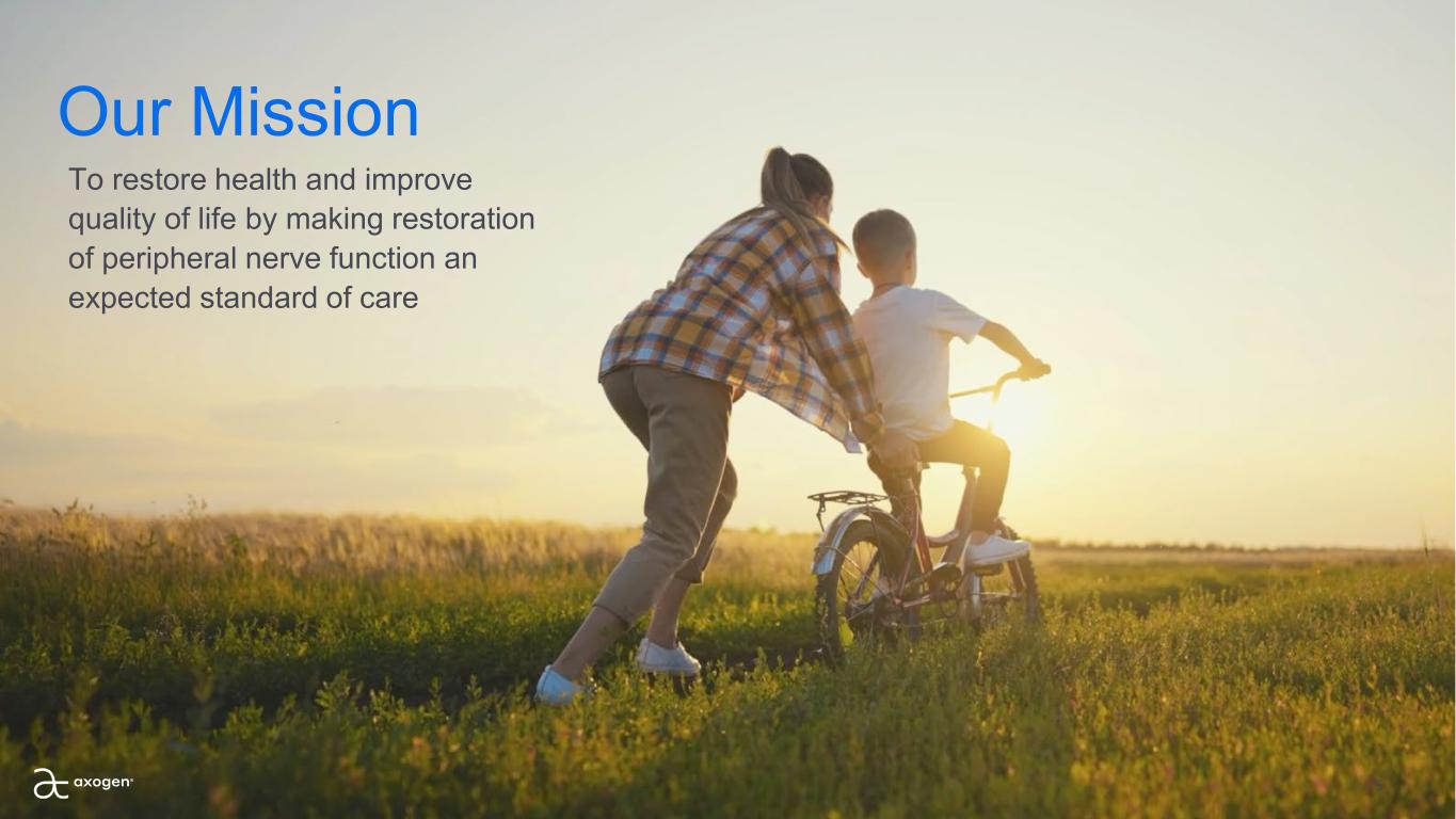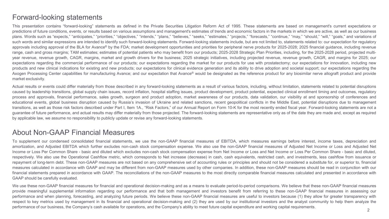 Forward-looking statements This presentation contains “forward-looking” statements as defined in the Private Securities Litigation Reform Act of 1995. These statements are based on management's current expectations or predictions of future conditions, events, or results based on various assumptions and management's estimates of trends and economic factors in the markets in which we are active, as well as our business plans. Words such as “expects,” “anticipates,” “priorities,” “objectives,” “intends,” “plans,” “believes,” “seeks,” “estimates,” “projects,” “forecasts,” “continue,” “may,” “should,” “will,” “goals,” and variations of such words and similar expressions are intended to identify such forward-looking statements. Forward-looking statements include, but are not limited to, statements related to: our expectation for regulatory approvals including approval of the BLA for Avance® by the FDA; market development opportunities and priorities for peripheral nerve products for 2025-2028; 2025 financial guidance, including revenue range, cash and gross margins; TAM estimates; estimates of potential patients who may benefit from our products; 2025-2028 Strategic Plan Priorities, including, for the 2025-2028 period, projected multi- year revenue, revenue growth, CAGR, margins, market and growth drivers for the business; 2025 strategic initiatives, including projected revenue, revenue growth, CAGR, and margins for 2025; our expectations regarding the commercial performance of our products; our expectations regarding the market for our products for use with prostatectomy; our expectations for innovation, including new products and new clinical indications for existing and new products; our expectations for clinical evidence generation and its ability to drive adoption and societal support; our expectations regarding the Axogen Processing Center capabilities for manufacturing Avance; and our expectation that Avance® would be designated as the reference product for any biosimilar nerve allograft product and provide market exclusivity. Actual results or events could differ materially from those described in any forward-looking statements as a result of various factors, including, without limitation, statements related to potential disruptions caused by leadership transitions, global supply chain issues, record inflation, hospital staffing issues, product development, product potential, expected clinical enrollment timing and outcomes, regulatory process and approvals, financial performance, sales growth, surgeon and product adoption, market awareness of our products, data validation, our visibility at and sponsorship of conferences and educational events, global business disruption caused by Russia’s invasion of Ukraine and related sanctions, recent geopolitical conflicts in the Middle East, potential disruptions due to management transitions, as well as those risk factors described under Part I, Item 1A., “Risk Factors,” of our Annual Report on Form 10-K for the most recently ended fiscal year. Forward-looking statements are not a guarantee of future performance, and actual results may differ materially from those projected. The forward-looking statements are representative only as of the date they are made and, except as required by applicable law, we assume no responsibility to publicly update or revise any forward-looking statements. About Non-GAAP Financial Measures To supplement our condensed consolidated financial statements, we use the non-GAAP financial measures of EBITDA, which measures earnings before interest, income taxes, depreciation and amortization, and Adjusted EBITDA which further excludes non-cash stock compensation expense. We also use the non-GAAP financial measures of Adjusted Net Income or Loss and Adjusted Net Income or Loss Per Common Share - basic and diluted which excludes non-cash stock compensation expense from Net Income or Loss and Net Income or Loss Per Common Share - basic and diluted, respectively. We also use the Operational Cashflow metric, which corresponds to Net increase (decrease) in cash, cash equivalents, restricted cash, and investments, less cashflow from issuance or repayment of long-term debt. These non-GAAP measures are not based on any comprehensive set of accounting rules or principles and should not be considered a substitute for, or superior to, financial measures calculated in accordance with GAAP and may be different from non-GAAP measures used by other companies. In addition, these non-GAAP measures should be read in conjunction with our financial statements prepared in accordance with GAAP. The reconciliations of the non-GAAP measures to the most directly comparable financial measures calculated and presented in accordance with GAAP should be carefully evaluated. We use these non-GAAP financial measures for financial and operational decision-making and as a means to evaluate period-to-period comparisons. We believe that these non-GAAP financial measures provide meaningful supplemental information regarding our performance and that both management and investors benefit from referring to these non-GAAP financial measures in assessing our performance and when planning, forecasting, and analyzing future periods. We believe these non-GAAP financial measures are useful to investors because (1) they allow for greater transparency with respect to key metrics used by management in its financial and operational decision-making and (2) they are used by our institutional investors and the analyst community to help them analyze the performance of our business, the Company’s cash available for operations, and the Company’s ability to meet future capital expenditure and working capital requirements. 2