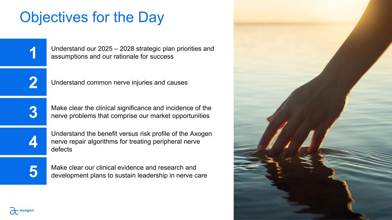 Objectives for the Day Understand our 2025 – 2028 strategic plan priorities and  assumptions and our rationale for success1 2 3 4 5 Understand common nerve injuries and causes  Make clear the clinical significance and incidence of the  nerve problems that comprise our market opportunities Understand the benefit versus risk profile of the Axogen nerve repair algorithms for treating peripheral nerve  defects Make clear our clinical evidence and research and  development plans to sustain leadership in nerve care 3