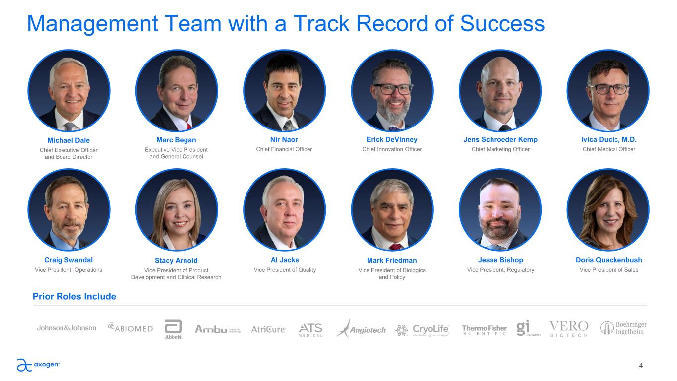 Management Team with a Track Record of Success Michael Dale Chief Executive Officer  and Board Director Marc Began Executive Vice President  and General Counsel Nir Naor Chief Financial Officer Erick DeVinney Chief Innovation Officer Jens Schroeder Kemp Chief Marketing Officer Ivica Ducic, M.D. Chief Medical Officer Craig Swandal Vice President, Operations Stacy Arnold Vice President of Product  Development and Clinical Research Al Jacks Vice President of Quality Mark Friedman Vice President of Biologics  and Policy Doris Quackenbush Vice President of Sales Jesse Bishop Vice President, Regulatory Prior Roles Include 4