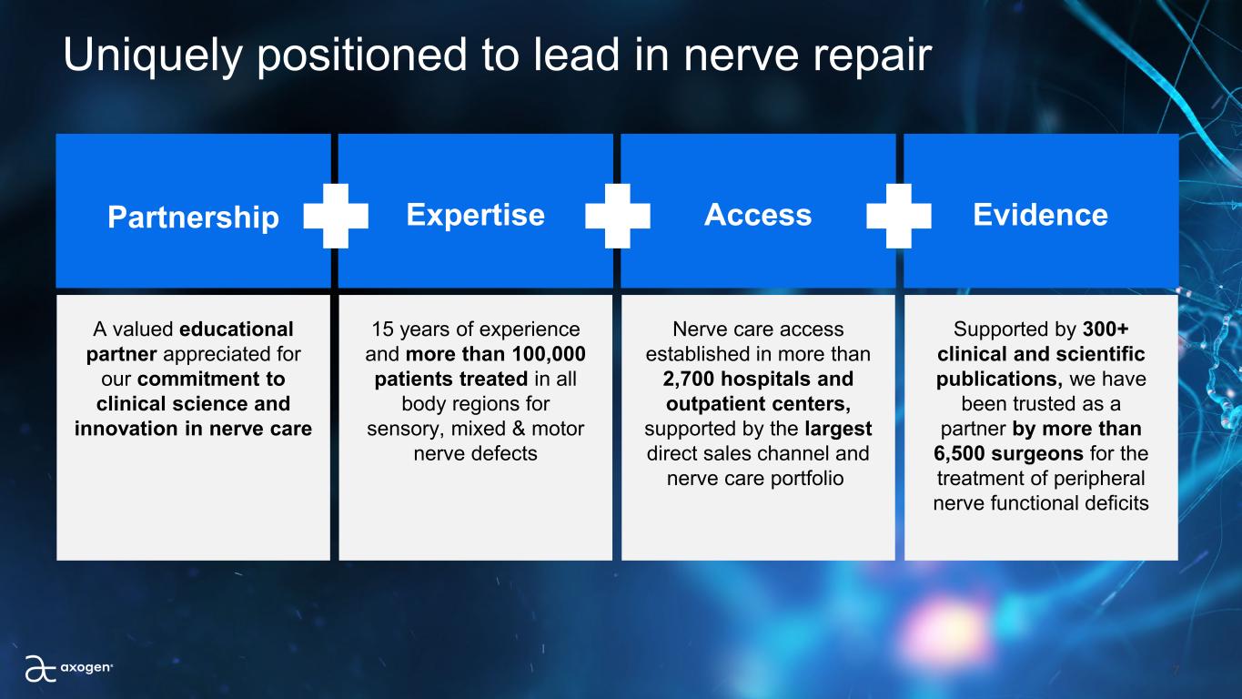 Uniquely positioned to lead in nerve repair A valued educational  partner appreciated for  our commitment to  clinical science and  innovation in nerve care 15 years of experience  and more than 100,000  patients treated in all  body regions for  sensory, mixed & motor  nerve defects Nerve care access  established in more than  2,700 hospitals and  outpatient centers,  supported by the largest  direct sales channel and  nerve care portfolio Supported by 300+  clinical and scientific  publications, we have  been trusted as a  partner by more than  6,500 surgeons for the  treatment of peripheral  nerve functional deficits Partnership Expertise Access Evidence 7
