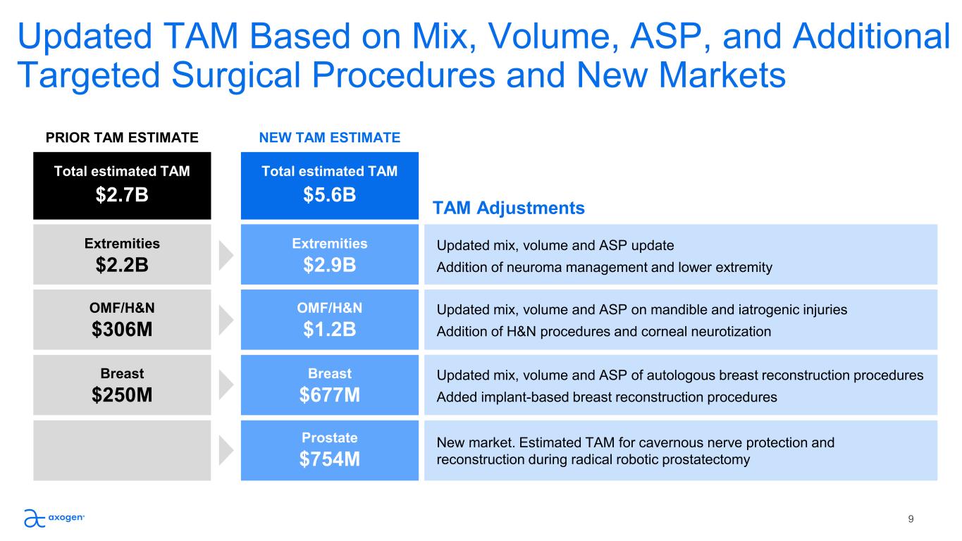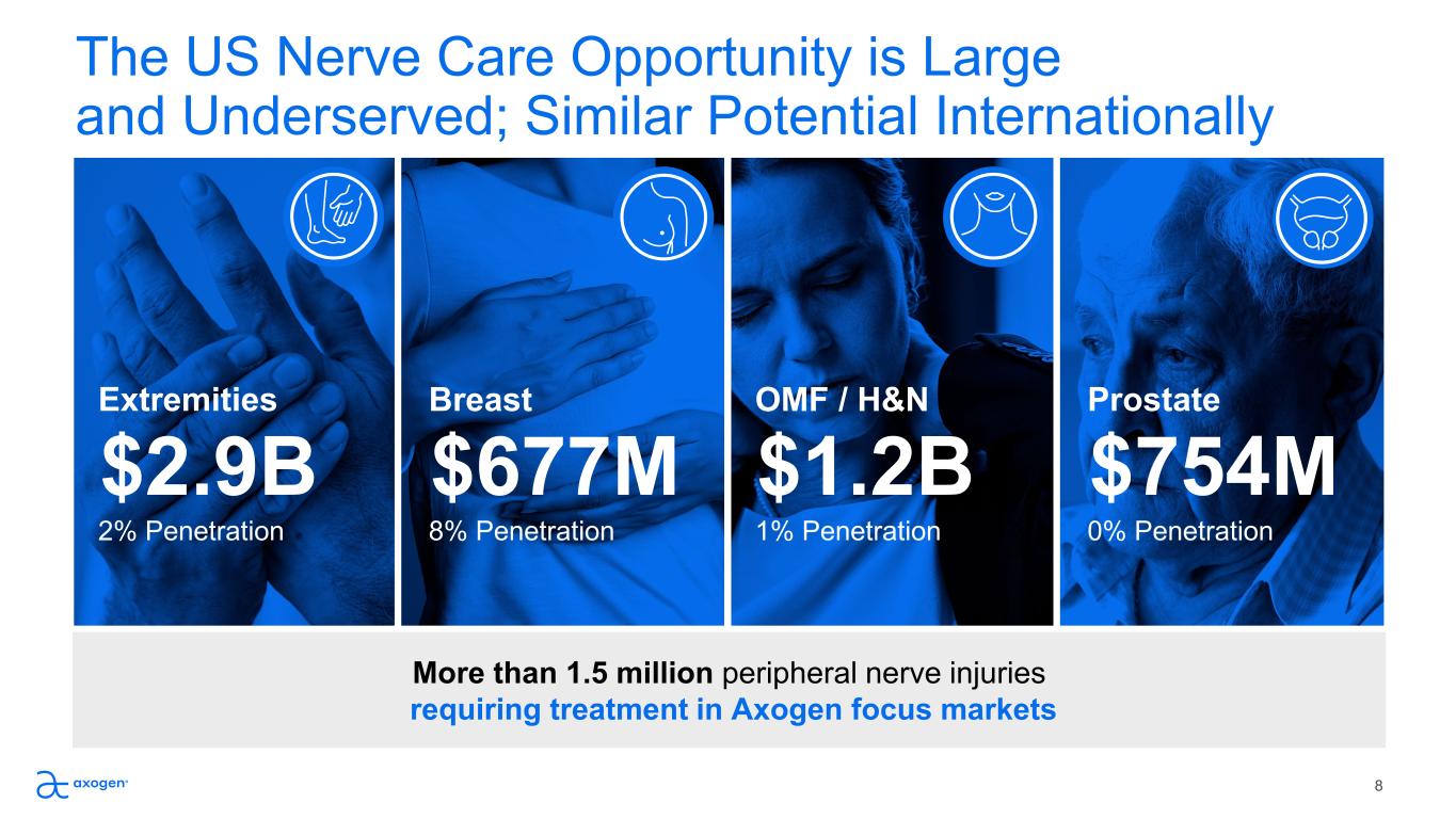 The US Nerve Care Opportunity is Large  and Underserved; Similar Potential Internationally More than 1.5 million peripheral nerve injuries requiring treatment in Axogen focus markets OMF / H&N $1.2B 1% Penetration Breast $677M 8% Penetration Prostate $754M 0% Penetration Extremities $2.9B 2% Penetration 8