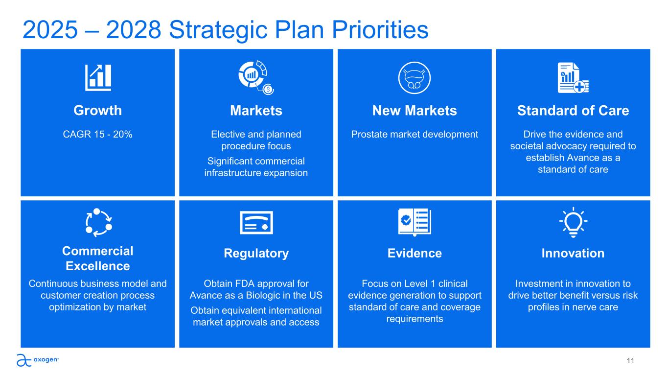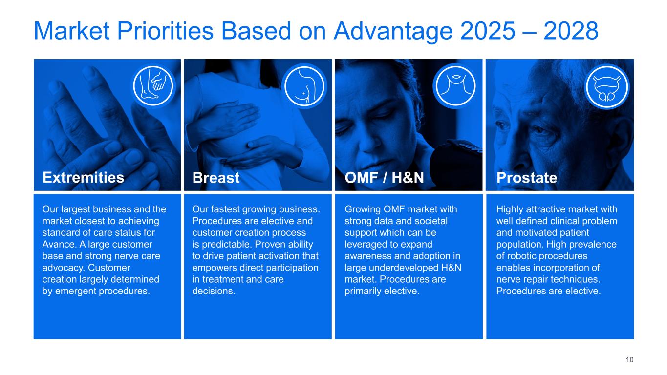 Market Priorities Based on Advantage 2025 – 2028 Extremities Our largest business and the  market closest to achieving  standard of care status for  Avance. A large customer  base and strong nerve care  advocacy. Customer  creation largely determined  by emergent procedures. OMF / H&N Growing OMF market with  strong data and societal  support which can be  leveraged to expand  awareness and adoption in  large underdeveloped H&N  market. Procedures are  primarily elective. Breast Our fastest growing business.  Procedures are elective and  customer creation process  is predictable. Proven ability  to drive patient activation that  empowers direct participation  in treatment and care  decisions.  Prostate Highly attractive market with  well defined clinical problem  and motivated patient  population. High prevalence  of robotic procedures  enables incorporation of  nerve repair techniques.  Procedures are elective. 10