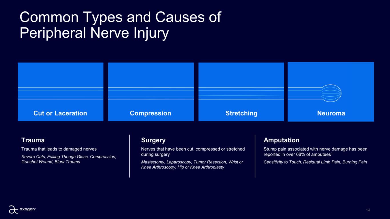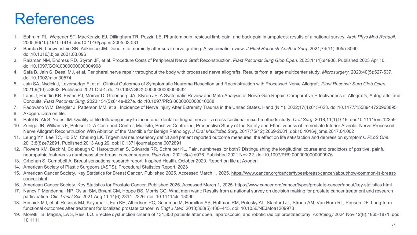 References 1. Ephraim PL, Wegener ST, MacKenzie EJ, Dillingham TR, Pezzin LE. Phantom pain, residual limb pain, and back pain in amputees: results of a national survey. Arch Phys Med Rehabil.  2005;86(10):1910-1919. doi:10.1016/j.apmr.2005.03.031 2. Bamba R, Loewenstein SN, Adkinson JM. Donor site morbidity after sural nerve grafting: A systematic review. J Plast Reconstr Aesthet Surg. 2021;74(11):3055-3060.  doi:10.1016/j.bjps.2021.03.096 3. Raizman NM, Endress RD, Styron JF, et al. Procedure Costs of Peripheral Nerve Graft Reconstruction. Plast Reconstr Surg Glob Open. 2023;11(4):e4908. Published 2023 Apr 10.  doi:10.1097/GOX.0000000000004908 4. Safa B, Jain S, Desai MJ, et al. Peripheral nerve repair throughout the body with processed nerve allografts: Results from a large multicenter study. Microsurgery. 2020;40(5):527-537.  doi:10.1002/micr.30574 5. Jain SA, Nydick J, Leversedge F, et al. Clinical Outcomes of Symptomatic Neuroma Resection and Reconstruction with Processed Nerve Allograft. Plast Reconstr Surg Glob Open.  2021;9(10):e3832. Published 2021 Oct 4. doi:10.1097/GOX.0000000000003832 6. Lans J, Eberlin KR, Evans PJ, Mercer D, Greenberg JA, Styron JF. A Systematic Review and Meta-Analysis of Nerve Gap Repair: Comparative Effectiveness of Allografts, Autografts, and  Conduits. Plast Reconstr Surg. 2023;151(5):814e-827e. doi:10.1097/PRS.0000000000010088 7. Padovano WM, Dengler J, Patterson MM, et al. Incidence of Nerve Injury After Extremity Trauma in the United States. Hand (N Y). 2022;17(4):615-623. doi:10.1177/1558944720963895 8. Axogen. Data on file.  9. Patel N, Ali S, Yates JM. Quality of life following injury to the inferior dental or lingual nerve – a cross-sectional mixed-methods study. Oral Surg. 2018;11(1):9-16. doi.10.1111/ors.12259 10. Zuniga JR, Williams F, Petrisor D. A Case-and-Control, Multisite, Positive Controlled, Prospective Study of the Safety and Effectiveness of Immediate Inferior Alveolar Nerve Processed  Nerve Allograft Reconstruction With Ablation of the Mandible for Benign Pathology. J Oral Maxillofac Surg. 2017;75(12):2669-2681. doi:10.1016/j.joms.2017.04.002 11. Leung YY, Lee TC, Ho SM, Cheung LK. Trigeminal neurosensory deficit and patient reported outcome measures: the effect on life satisfaction and depression symptoms. PLoS One.  2013;8(8):e72891. Published 2013 Aug 29. doi:10.1371/journal.pone.0072891 12. Flowers KM, Beck M, Colebaugh C, Haroutounian S, Edwards RR, Schreiber KL. Pain, numbness, or both? Distinguishing the longitudinal course and predictors of positive, painful  neuropathic features vs numbness after breast cancer surgery. Pain Rep. 2021;6(4):e976. Published 2021 Nov 22. doi:10.1097/PR9.0000000000000976 13. Crhohan S, Campbell A. Breast sensations research report. Inspired Health. October 2020. Report on file at Axogen  14. American Society of Plastic Surgeons (ASPS), Procedural Statistics Report, 2023 15. American Cancer Society. Key Statistics for Breast Cancer. Published 2025. Accessed March 1, 2025. https://www.cancer.org/cancer/types/breast-cancer/about/how-common-is-breast- cancer.html 16. American Cancer Society. Key Statistics for Prostate Cancer. Published 2025. Accessed March 1, 2025. https://www.cancer.org/cancer/types/prostate-cancer/about/key-statistics.html 17. Nancy P Mendenhall NP, Osian SM, Bryant CM, Hoppe BS, Morris CG. What men want: Results from a national survey on decision making for prostate cancer treatment and research  participation. Clin Transl Sci. 2021 Aug 11;14(6):2314–2326. doi: 10.1111/cts.13090 18. Resnick MJ, et al. Resnick MJ, Koyama T, Fan KH, Albertsen PC, Goodman M, Hamilton AS, Hoffman RM, Potosky AL, Stanford JL, Stroup AM, Van Horn RL, Penson DF. Long-term  functional outcomes after treatment for localized prostate cancer. N Engl J Med. 2013;368(5):436–445. doi: 10.1056/NEJMoa1209978 19. Moretti TB, Magna, LA 3, Reis, LO. Erectile dysfunction criteria of 131,350 patients after open, laparoscopic, and robotic radical prostatectomy. Andrology 2024 Nov;12(8):1865-1871. doi:  10.1111 71