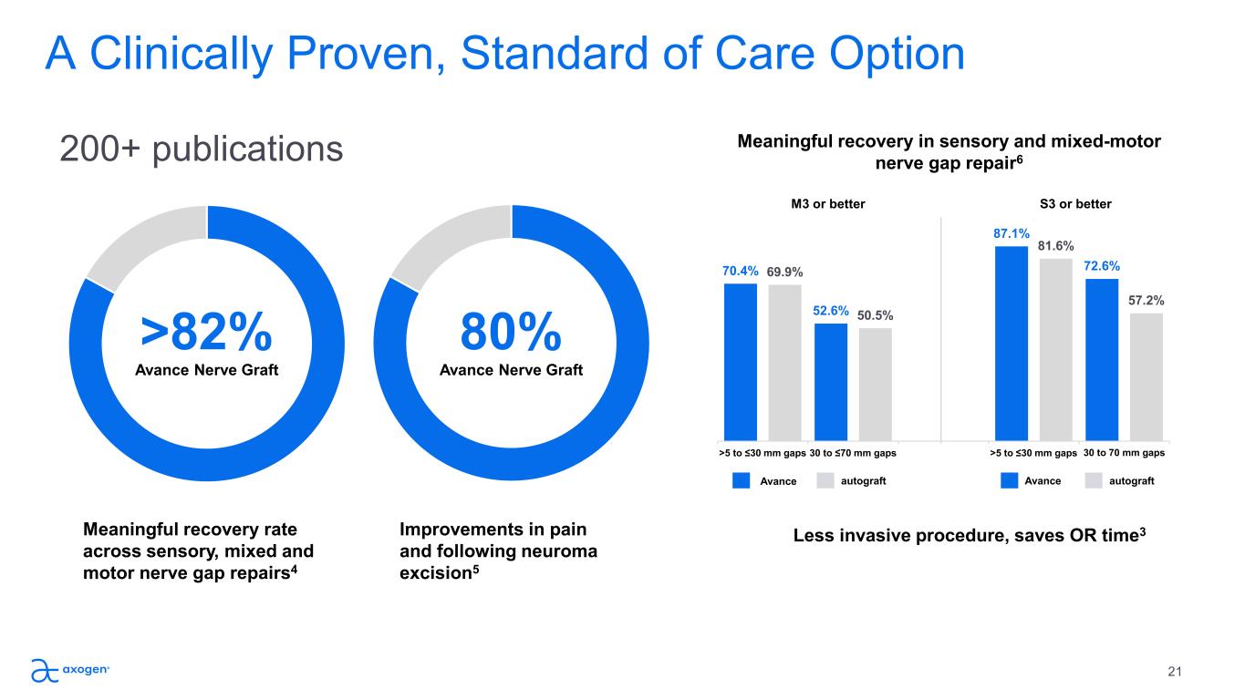 A Clinically Proven, Standard of Care Option Meaningful recovery rate  across sensory, mixed and  motor nerve gap repairs4 Less invasive procedure, saves OR time3Improvements in pain  and following neuroma  excision5 >82% Avance Nerve Graft 80% Avance Nerve Graft 70.4% 52.6% 87.1% 72.6%69.9% 50.5% 81.6% 57.2% >5 to ≤30 mm gaps 30 to ≤70 mm gaps >5 to ≤30 mm gaps 30 to 70 mm gaps M3 or better S3 or better 200+ publications Meaningful recovery in sensory and mixed-motor  nerve gap repair6 autograft Avance autograft 21 Avance
