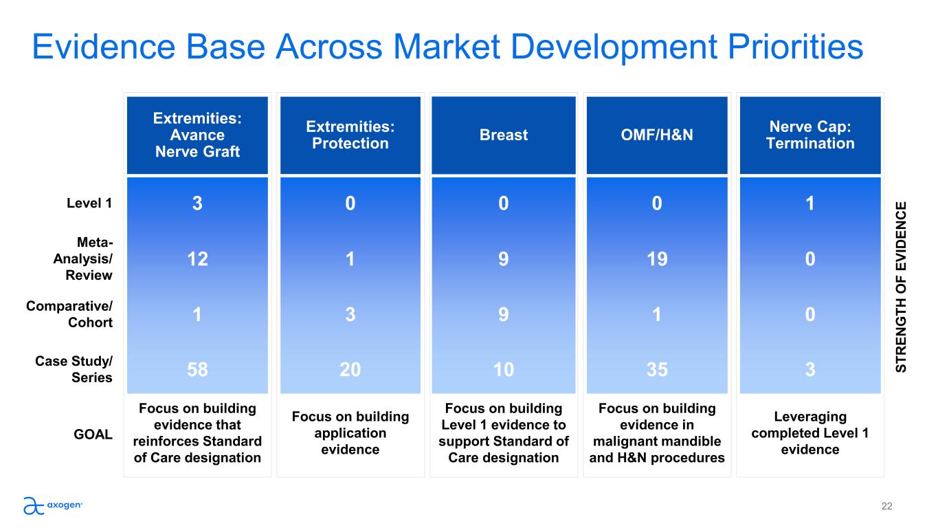 Evidence Base Across Market Development Priorities  Level 1 Meta- Analysis/  Review Comparative/ Cohort Case Study/ Series Extremities:  Avance  Nerve Graft 3 12 1 58 Focus on building  evidence that  reinforces Standard  of Care designation Extremities:  Protection 0 1 3 20 Focus on building  application  evidence Breast 0 9 9 10 Focus on building  Level 1 evidence to  support Standard of  Care designation OMF/H&N 0 19 1 35 Focus on building  evidence in  malignant mandible  and H&N procedures Nerve Cap:  Termination 1 0 0 3 Leveraging  completed Level 1  evidence GOAL 22 ST R EN G TH  O F  EV ID EN C E
