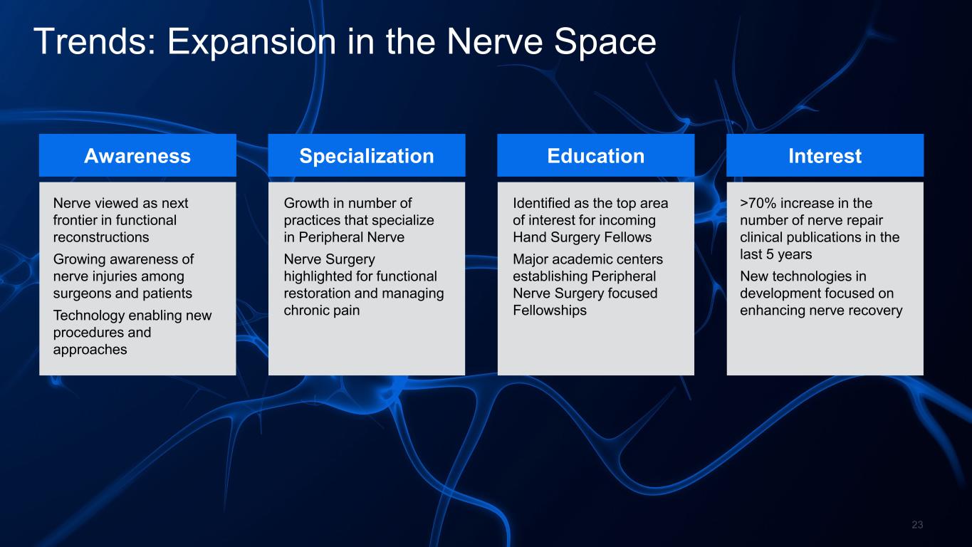 Trends: Expansion in the Nerve Space Interest >70% increase in the  number of nerve repair  clinical publications in the  last 5 years New technologies in  development focused on  enhancing nerve recovery Awareness Nerve viewed as next  frontier in functional  reconstructions Growing awareness of  nerve injuries among  surgeons and patients Technology enabling new  procedures and  approaches Specialization Growth in number of  practices that specialize  in Peripheral Nerve Nerve Surgery   highlighted for functional  restoration and managing  chronic pain Education Identified as the top area  of interest for incoming  Hand Surgery Fellows Major academic centers  establishing Peripheral  Nerve Surgery focused  Fellowships 23