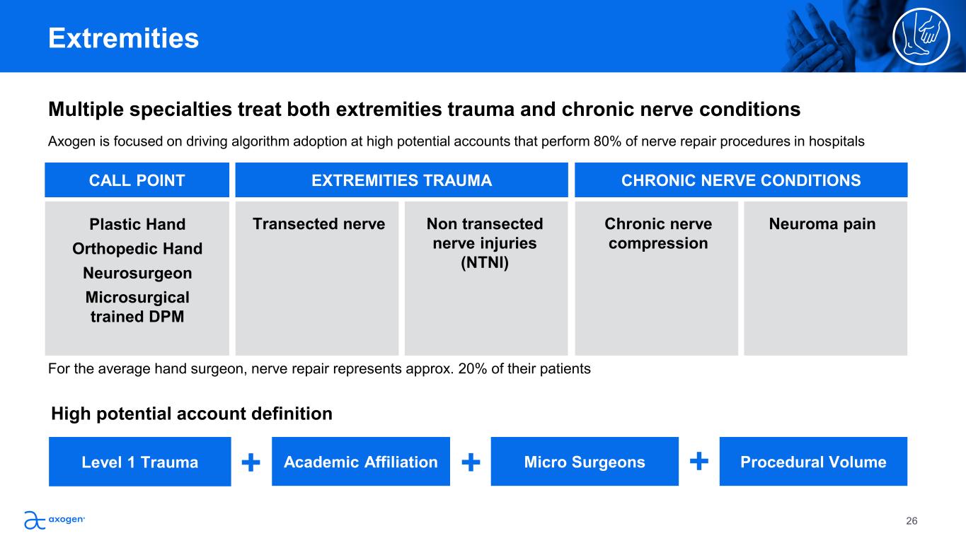 Multiple specialties treat both extremities trauma and chronic nerve conditions  Axogen is focused on driving algorithm adoption at high potential accounts that perform 80% of nerve repair procedures in hospitals Extremities t iti   CALL POINT Plastic Hand Orthopedic Hand Neurosurgeon Microsurgical  trained DPM EXTREMITIES TRAUMA Transected nerve Non transected  nerve injuries  (NTNI) CHRONIC NERVE CONDITIONS Chronic nerve  compression Neuroma pain High potential account definition Level 1 Trauma Academic Affiliation Micro Surgeons+ + Procedural Volume+ For the average hand surgeon, nerve repair represents approx. 20% of their patients 26