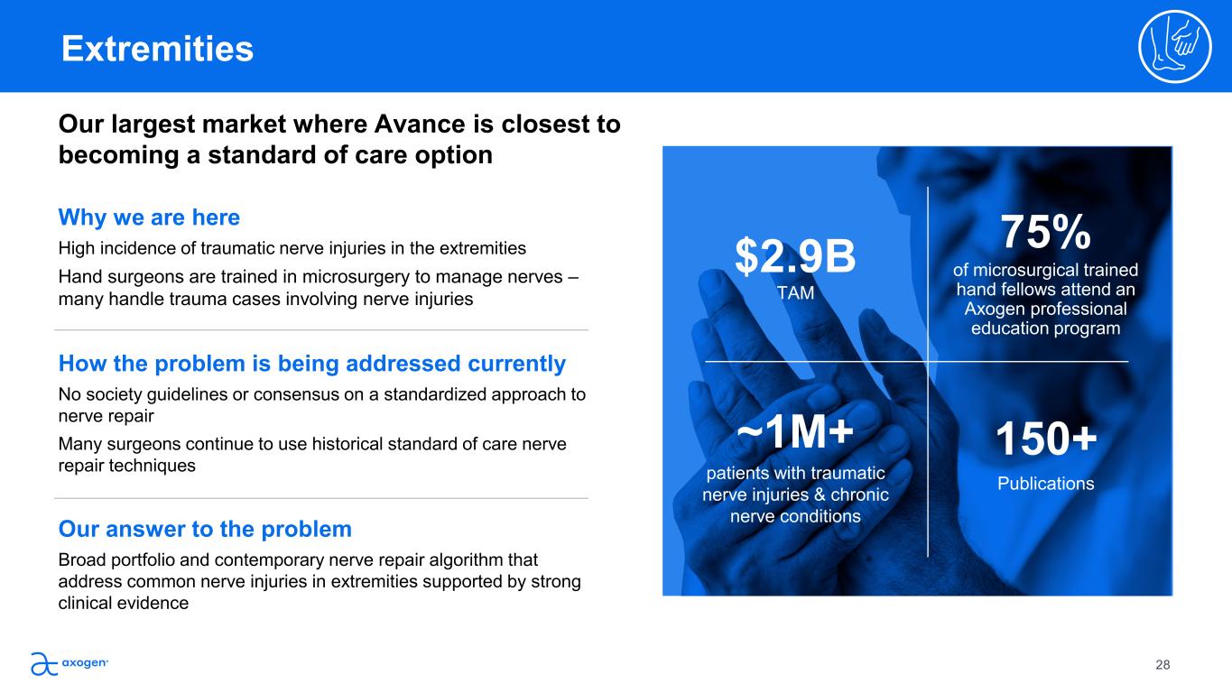 Our answer to the problem Broad portfolio and contemporary nerve repair algorithm that  address common nerve injuries in extremities supported by strong  clinical evidence  How the problem is being addressed currently No society guidelines or consensus on a standardized approach to  nerve repair Many surgeons continue to use historical standard of care nerve  repair techniques  Our largest market where Avance is closest to  becoming a standard of care option  Why we are here High incidence of traumatic nerve injuries in the extremities Hand surgeons are trained in microsurgery to manage nerves – many handle trauma cases involving nerve injuries $2.9B TAM 75% of microsurgical trained  hand fellows attend an  Axogen professional  education program ~1M+ patients with traumatic  nerve injuries & chronic  nerve conditions  150+ Publications 28 Extremities