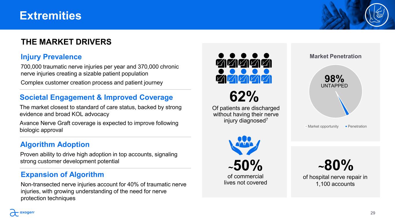 Injury Prevalence  700,000 traumatic nerve injuries per year and 370,000 chronic  nerve injuries creating a sizable patient population Complex customer creation process and patient journey of commercial  lives not covered ~50% Of patients are discharged  without having their nerve  injury diagnosed7 62% Market Penetration Market opportunity Penetration 98% UNTAPPED THE MARKET DRIVERS ~80%  Societal Engagement & Improved Coverage  The market closest to standard of care status, backed by strong  evidence and broad KOL advocacy Avance Nerve Graft coverage is expected to improve following biologic approval Algorithm Adoption   Proven ability to drive high adoption in top accounts, signaling  strong customer development potential Expansion of Algorithm Non-transected nerve injuries account for 40% of traumatic nerve  injuries, with growing understanding of the need for nerve  protection techniques of hospital nerve repair in  1,100 accounts  Extremities  29