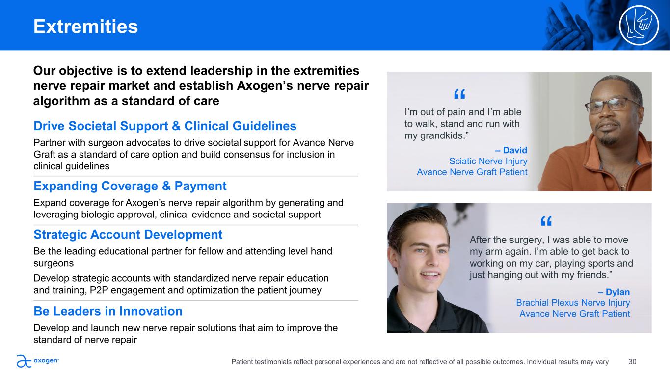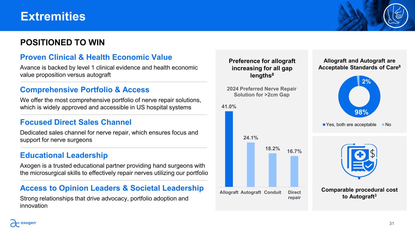 Our objective is to extend leadership in the extremities  nerve repair market and establish Axogen’s nerve repair  algorithm as a standard of care Drive Societal Support & Clinical Guidelines Partner with surgeon advocates to drive societal support for Avance Nerve  Graft as a standard of care option and build consensus for inclusion in  clinical guidelines Be Leaders in Innovation  Develop and launch new nerve repair solutions that aim to improve the  standard of nerve repair Expanding Coverage & Payment  Expand coverage for Axogen’s nerve repair algorithm by generating and  leveraging biologic approval, clinical evidence and societal support Strategic Account Development Be the leading educational partner for fellow and attending level hand  surgeons   Develop strategic accounts with standardized nerve repair education  and training, P2P engagement and optimization the patient journey Extremities  “ “After the surgery, I was able to move  my arm again. I’m able to get back to  working on my car, playing sports and  just hanging out with my friends.” I’m out of pain and I’m able  to walk, stand and run with  my grandkids.” – Dylan Brachial Plexus Nerve Injury  Avance Nerve Graft Patient – David Sciatic Nerve Injury Avance Nerve Graft Patient 30Patient testimonials reflect personal experiences and are not reflective of all possible outcomes. Individual results may vary