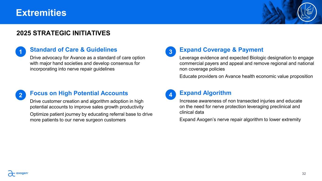 Standard of Care & Guidelines Drive advocacy for Avance as a standard of care option  with major hand societies and develop consensus for  incorporating into nerve repair guidelines 2025 STRATEGIC INITIATIVES Extremities  Expand Algorithm Increase awareness of non transected injuries and educate  on the need for nerve protection leveraging preclinical and  clinical data Expand Axogen’s nerve repair algorithm to lower extremity  Focus on High Potential Accounts Drive customer creation and algorithm adoption in high  potential accounts to improve sales growth productivity Optimize patient journey by educating referral base to drive  more patients to our nerve surgeon customers Expand Coverage & Payment Leverage evidence and expected Biologic designation to engage  commercial payers and appeal and remove regional and national  non coverage policies Educate providers on Avance health economic value proposition t iti   1 2 3 4 32