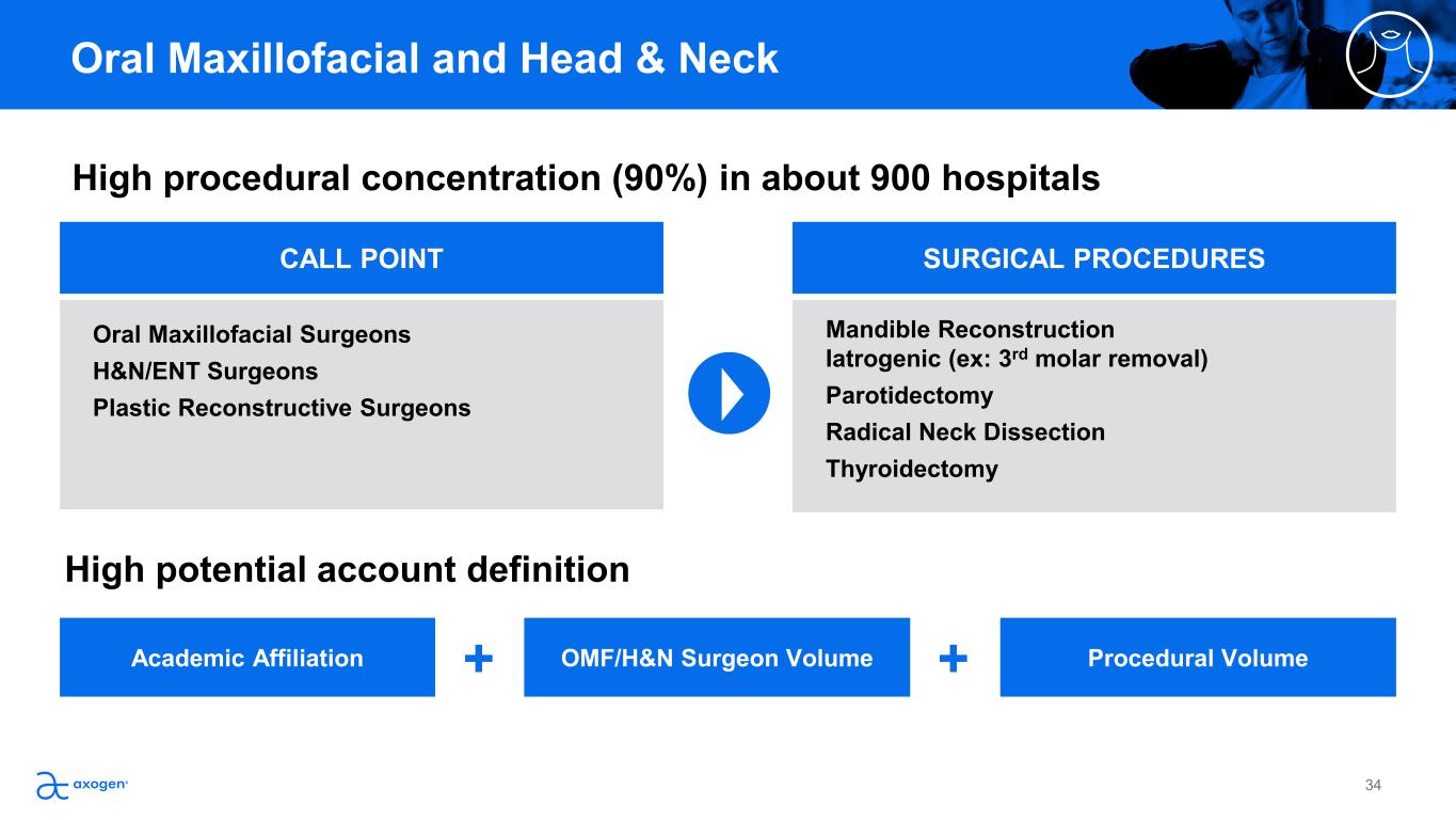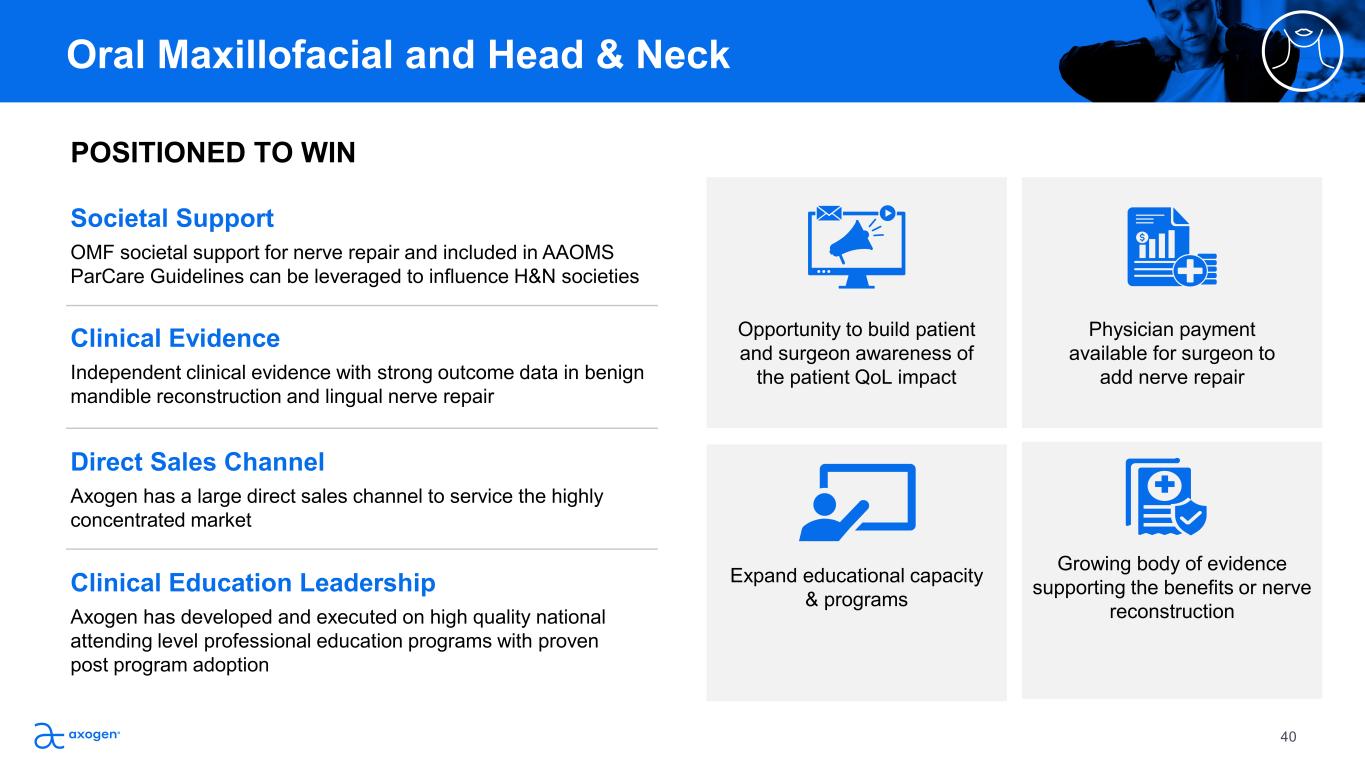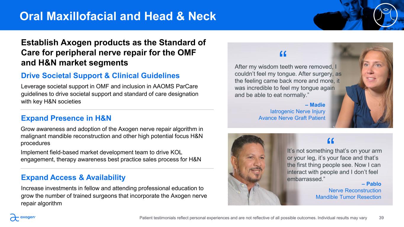 Establish Axogen products as the Standard of  Care for peripheral nerve repair for the OMF  and H&N market segments Drive Societal Support & Clinical Guidelines Leverage societal support in OMF and inclusion in AAOMS ParCare  guidelines to drive societal support and standard of care designation  with key H&N societies Expand Access & Availability Increase investments in fellow and attending professional education to  grow the number of trained surgeons that incorporate the Axogen nerve  repair algorithm Expand Presence in H&N Grow awareness and adoption of the Axogen nerve repair algorithm in  malignant mandible reconstruction and other high potential focus H&N  procedures  Implement field-based market development team to drive KOL  engagement, therapy awareness best practice sales process for H&N Oral Maxillofacial and Head & Neck After my wisdom teeth were removed, I  couldn’t feel my tongue. After surgery, as  the feeling came back more and more, it  was incredible to feel my tongue again  and be able to eat normally.” – Madie Iatrogenic Nerve Injury  Avance Nerve Graft Patient “ It’s not something that’s on your arm  or your leg, it’s your face and that’s  the first thing people see. Now I can  interact with people and I don’t feel  embarrassed.” “ – Pablo Nerve Reconstruction Mandible Tumor Resection  39Patient testimonials reflect personal experiences and are not reflective of all possible outcomes. Individual results may vary