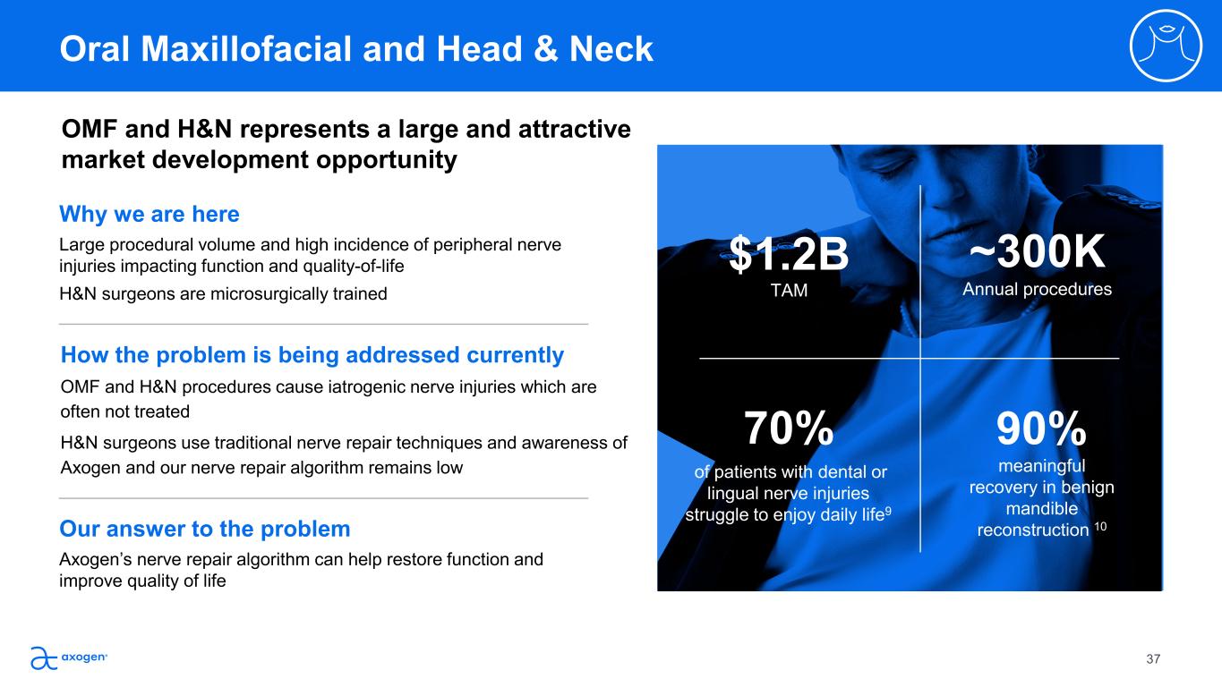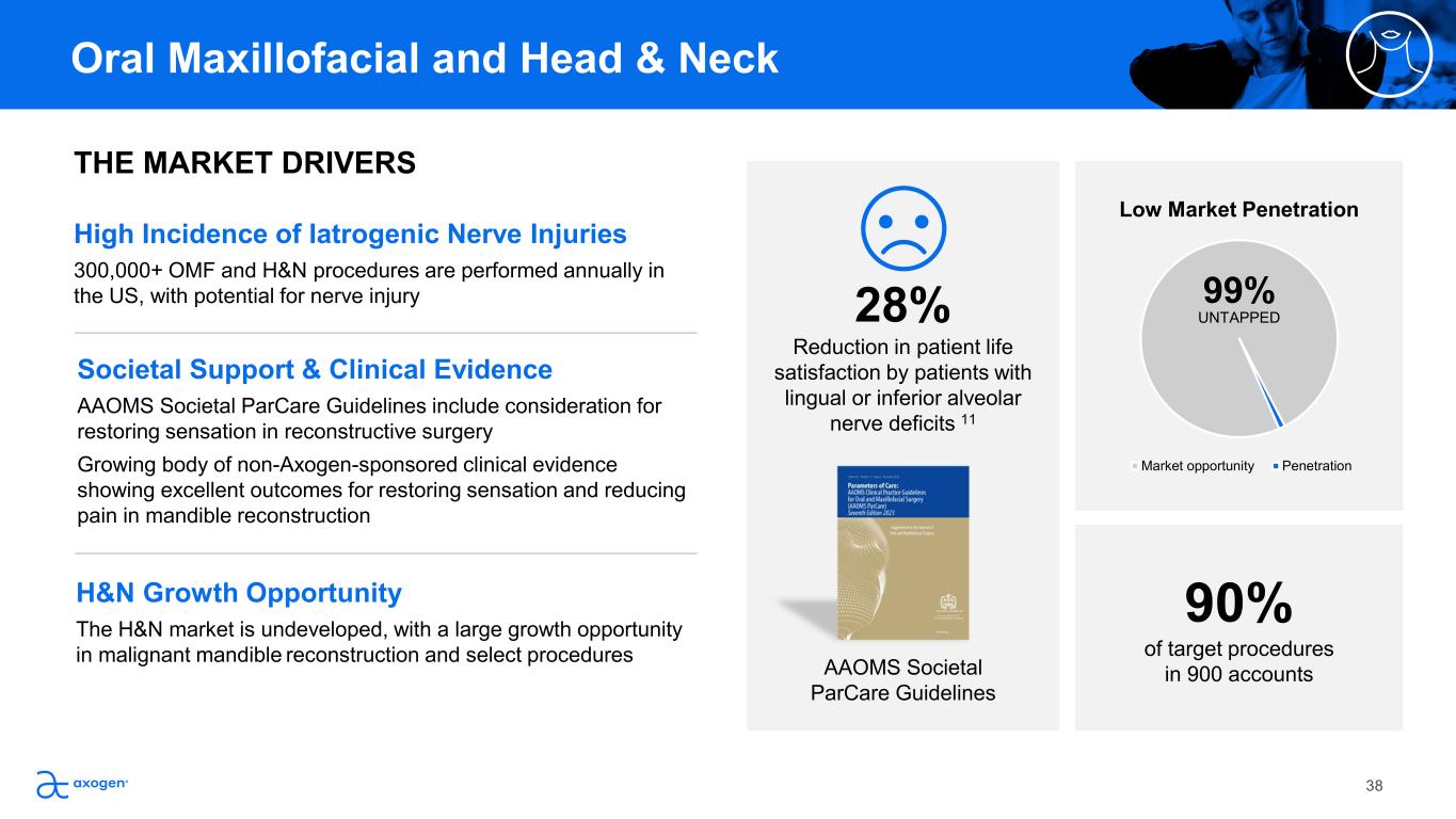 Our answer to the problem Axogen’s nerve repair algorithm can help restore function and  improve quality of life How the problem is being addressed currently OMF and H&N procedures cause iatrogenic nerve injuries which are  often not treated H&N surgeons use traditional nerve repair techniques and awareness of  Axogen and our nerve repair algorithm remains low Why we are here Large procedural volume and high incidence of peripheral nerve  injuries impacting function and quality-of-life H&N surgeons are microsurgically trained $1.2B TAM ~300K Annual procedures 70% of patients with dental or  lingual nerve injuries  struggle to enjoy daily life9 90% meaningful  recovery in benign  mandible  reconstruction 10 OMF and H&N represents a large and attractive  market development opportunity Oral Maxillofacial and Head & Neck 37