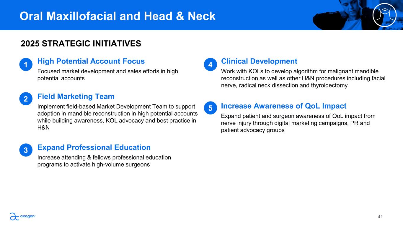2025 STRATEGIC INITIATIVES High Potential Account Focus Focused market development and sales efforts in high  potential accounts  Increase Awareness of QoL Impact  Expand patient and surgeon awareness of QoL impact from  nerve injury through digital marketing campaigns, PR and  patient advocacy groups Field Marketing Team Implement field-based Market Development Team to support  adoption in mandible reconstruction in high potential accounts  while building awareness, KOL advocacy and best practice in  H&N Expand Professional Education  Increase attending & fellows professional education  programs to activate high-volume surgeons Clinical Development  Work with KOLs to develop algorithm for malignant mandible  reconstruction as well as other H&N procedures including facial  nerve, radical neck dissection and thyroidectomy Oral Maxillofacial and Head & Neck 1 4 2 5 3 41