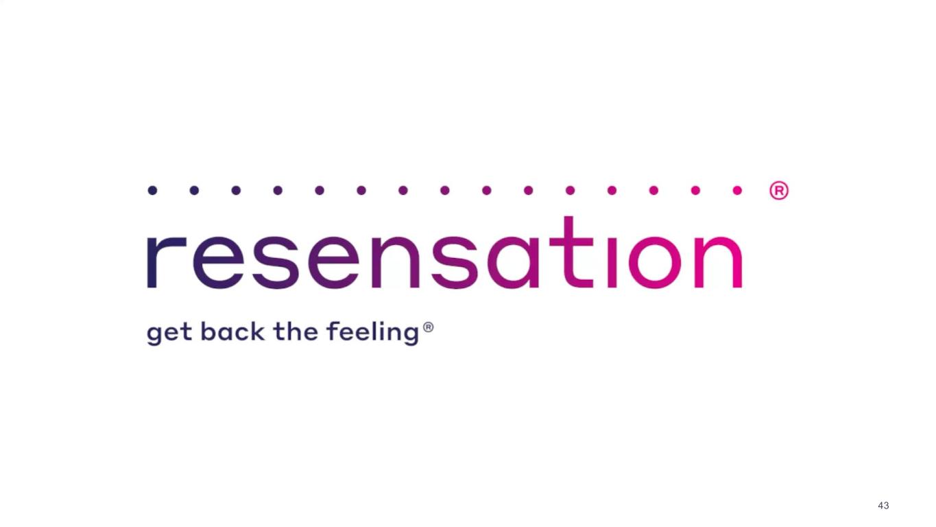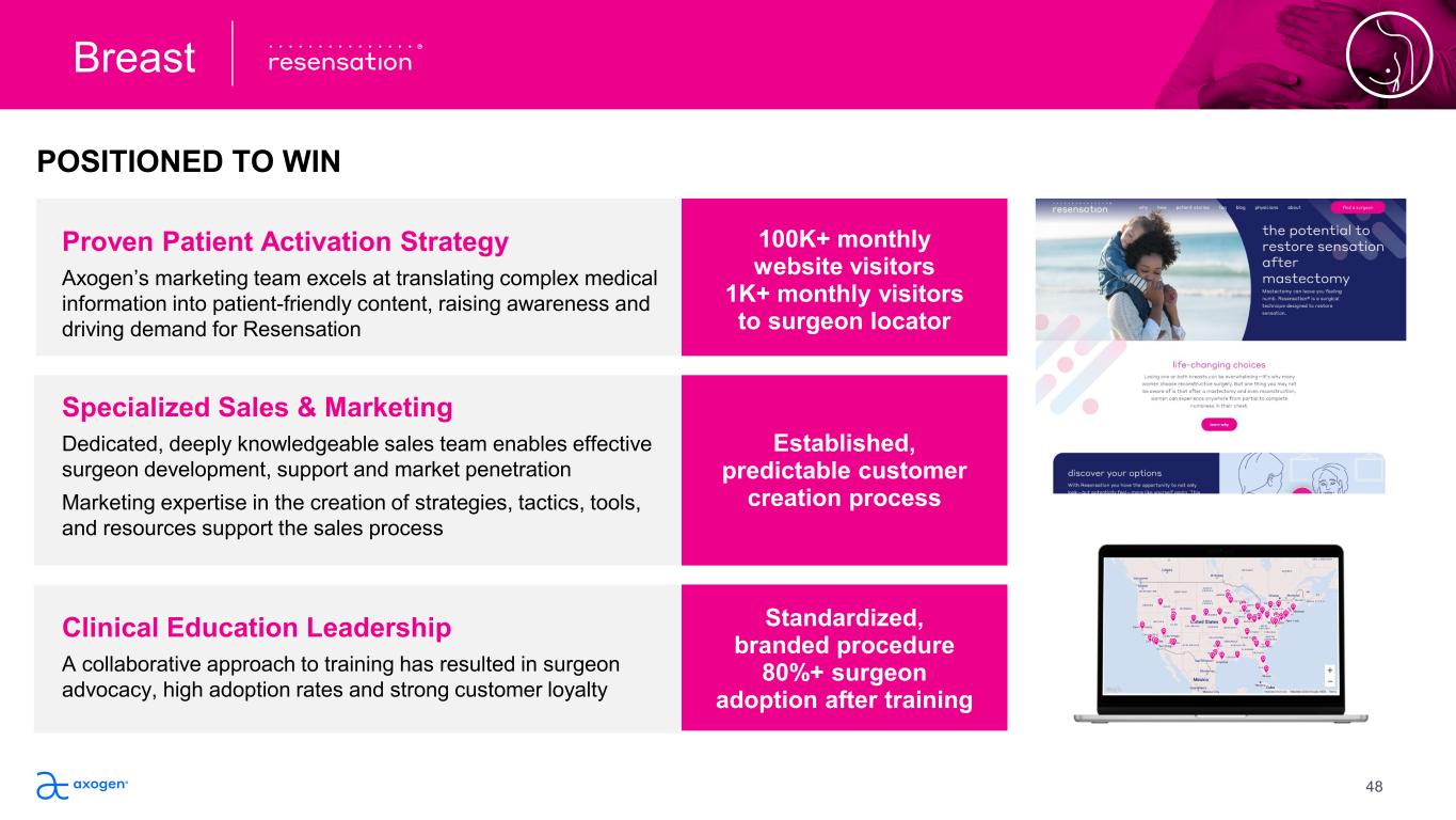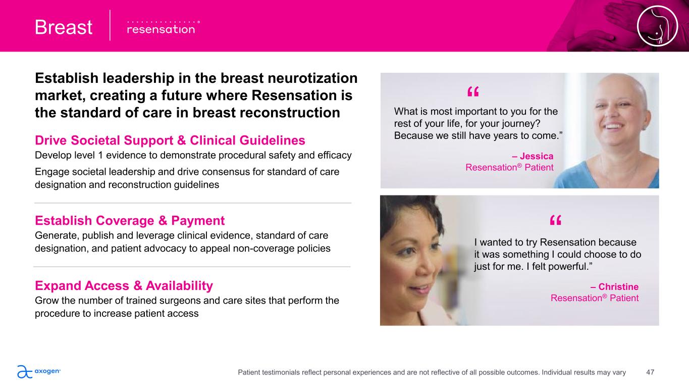 Establish leadership in the breast neurotization  market, creating a future where Resensation is  the standard of care in breast reconstruction  Following the construct of Strategy Statement: 1. Objective 2. Market Drivers 3. Strengths 4. Strategy Drive Societal Support & Clinical Guidelines Develop level 1 evidence to demonstrate procedural safety and efficacy  Engage societal leadership and drive consensus for standard of care  designation and reconstruction guidelines Establish Coverage & Payment Generate, publish and leverage clinical evidence, standard of care  designation, and patient advocacy to appeal non-coverage policies Expand Access & Availability Grow the number of trained surgeons and care sites that perform the  procedure to increase patient access What is most important to you for the  rest of your life, for your journey?  Because we still have years to come.” – Jessica Resensation® Patient “ I wanted to try Resensation because  it was something I could choose to do  just for me. I felt powerful.” “ – Christine Resensation® Patient Breast Patient testimonials reflect personal experiences and are not reflective of all possible outcomes. Individual results may vary 47
