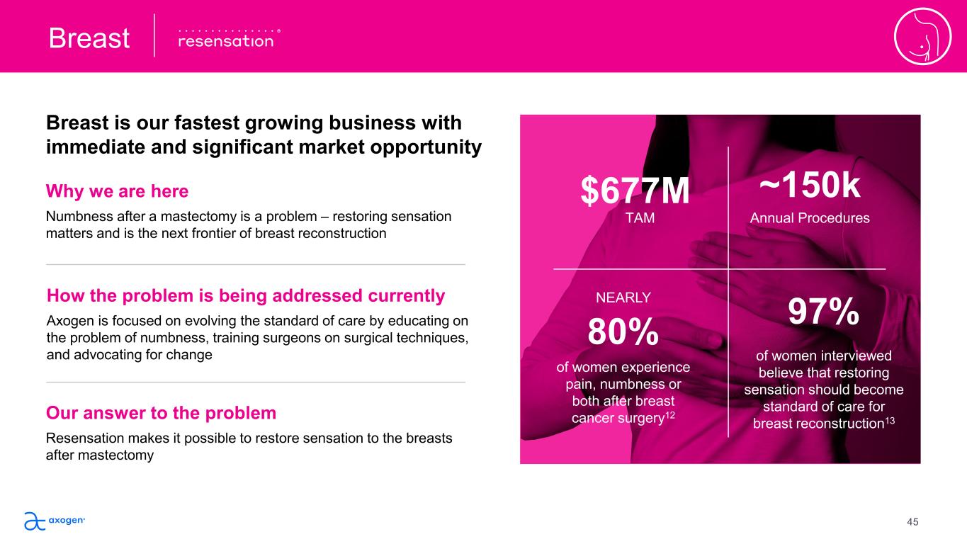Why we are here Numbness after a mastectomy is a problem – restoring sensation  matters and is the next frontier of breast reconstruction Our answer to the problem Resensation makes it possible to restore sensation to the breasts after mastectomy Breast is our fastest growing business with  immediate and significant market opportunity Breast How the problem is being addressed currently Axogen is focused on evolving the standard of care by educating on  the problem of numbness, training surgeons on surgical techniques,  and advocating for change TAM ~150k Annual Procedures 80% of women experience  pain, numbness or  both after breast  cancer surgery12 NEARLY $677M of women interviewed  believe that restoring  sensation should become  standard of care for  breast reconstruction13 97% 45