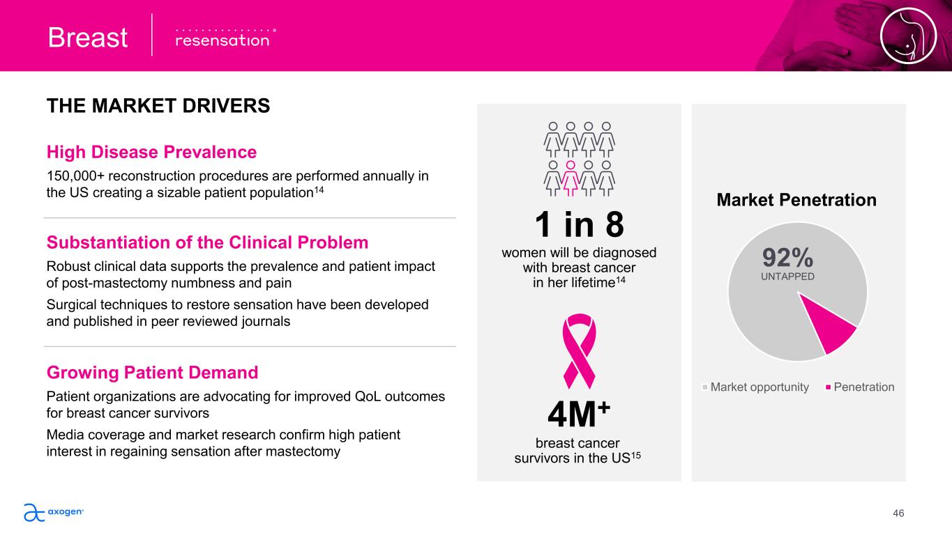 THE MARKET DRIVERS Breast breast cancer  survivors in the US15 4M+ women will be diagnosed  with breast cancer  in her lifetime14 1 in 8 Market Penetration Market opportunity Penetration 92% UNTAPPED Substantiation of the Clinical Problem Robust clinical data supports the prevalence and patient impact  of post-mastectomy numbness and pain Surgical techniques to restore sensation have been developed  and published in peer reviewed journals High Disease Prevalence 150,000+ reconstruction procedures are performed annually in  the US creating a sizable patient population14 Growing Patient Demand Patient organizations are advocating for improved QoL outcomes  for breast cancer survivors Media coverage and market research confirm high patient  interest in regaining sensation after mastectomy  46