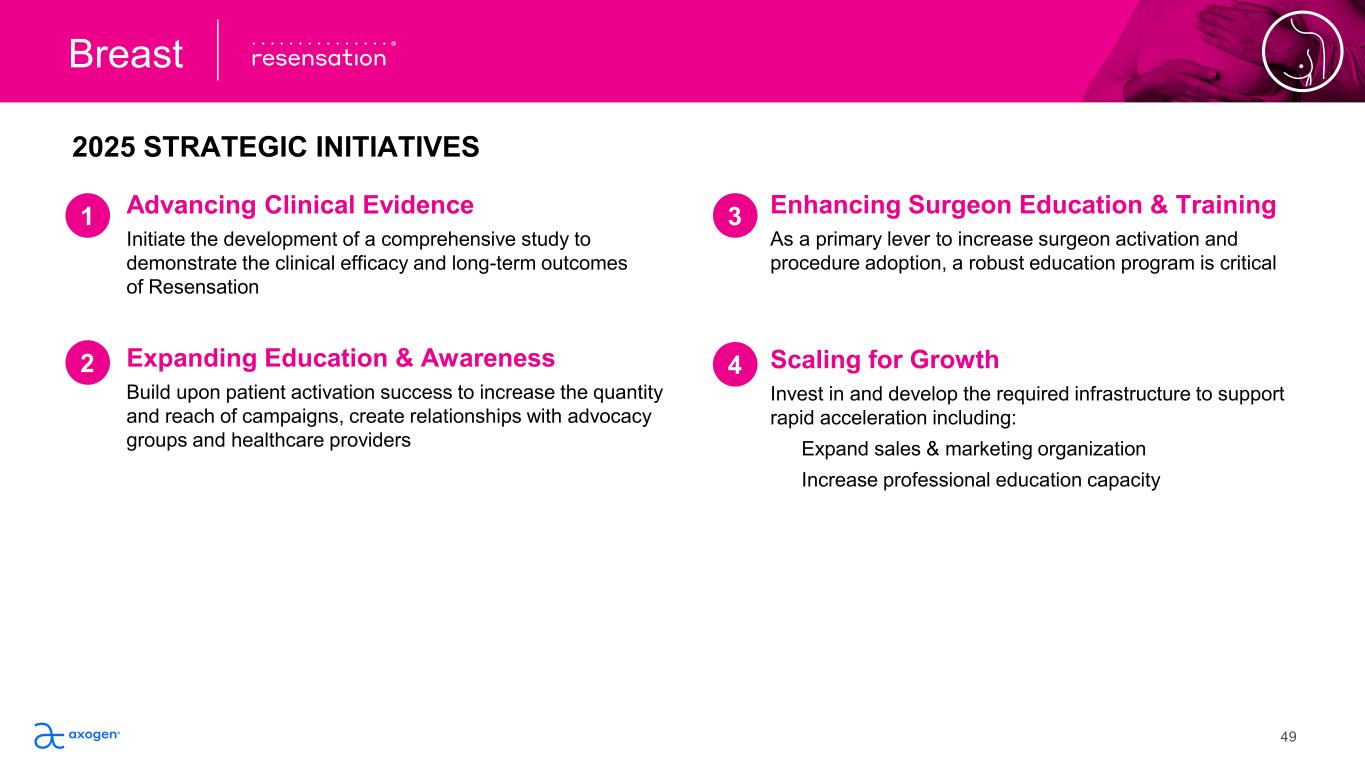 Scaling for Growth Invest in and develop the required infrastructure to support  rapid acceleration including: Expand sales & marketing organization Increase professional education capacity  2025 STRATEGIC INITIATIVES Advancing Clinical Evidence Initiate the development of a comprehensive study to  demonstrate the clinical efficacy and long-term outcomes  of Resensation  Expanding Education & Awareness Build upon patient activation success to increase the quantity  and reach of campaigns, create relationships with advocacy  groups and healthcare providers Enhancing Surgeon Education & Training As a primary lever to increase surgeon activation and  procedure adoption, a robust education program is critical Breast 1 2 3 4 49
