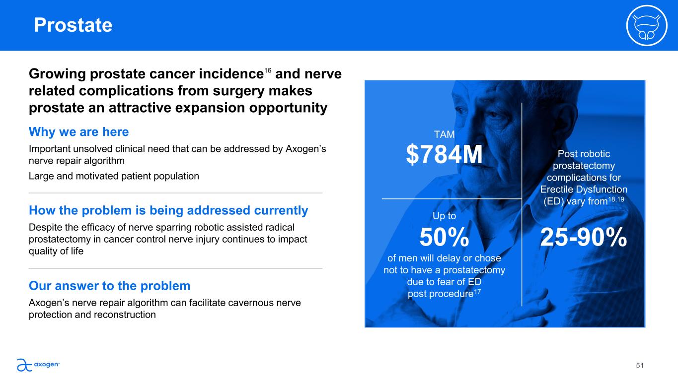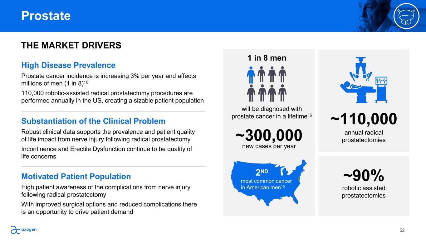 Oral Maxillofacial and Head & Neck $784M TAM of men will delay or chose  not to have a prostatectomy  due to fear of ED post procedure17 Prostate 50% Up to Post robotic  prostatectomy  complications for  Erectile Dysfunction  (ED) vary from18,19 25-90% Why we are here Important unsolved clinical need that can be addressed by Axogen’s  nerve repair algorithm Large and motivated patient population Our answer to the problem Axogen’s nerve repair algorithm can facilitate cavernous nerve  protection and reconstruction  How the problem is being addressed currently Despite the efficacy of nerve sparring robotic assisted radical  prostatectomy in cancer control nerve injury continues to impact  quality of life Growing prostate cancer incidence16 and nerve  related complications from surgery makes  prostate an attractive expansion opportunity 51