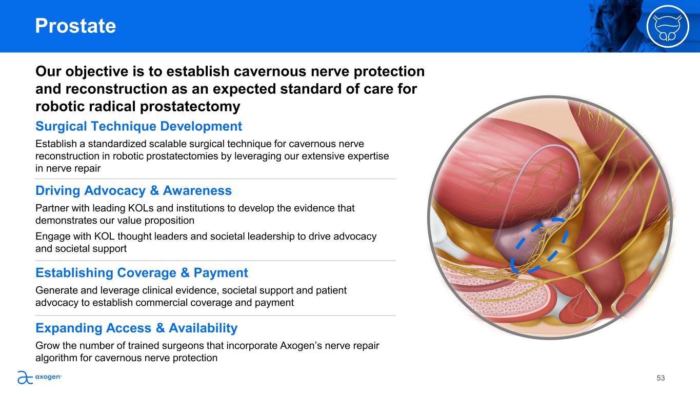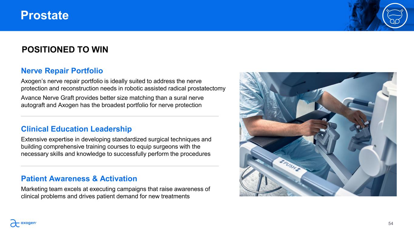 Our objective is to establish cavernous nerve protection  and reconstruction as an expected standard of care for  robotic radical prostatectomy Expanding Access & Availability Grow the number of trained surgeons that incorporate Axogen’s nerve repair  algorithm for cavernous nerve protection  Surgical Technique Development Establish a standardized scalable surgical technique for cavernous nerve  reconstruction in robotic prostatectomies by leveraging our extensive expertise  in nerve repair Driving Advocacy & Awareness Partner with leading KOLs and institutions to develop the evidence that  demonstrates our value proposition  Engage with KOL thought leaders and societal leadership to drive advocacy  and societal support Establishing Coverage & Payment Generate and leverage clinical evidence, societal support and patient  advocacy to establish commercial coverage and payment 53 Prostate