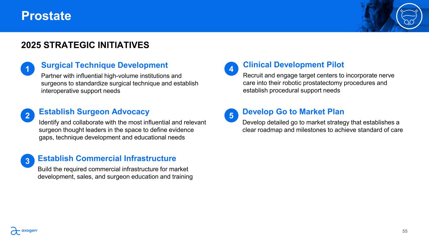 POSITIONED TO WIN Clinical Education Leadership Extensive expertise in developing standardized surgical techniques and  building comprehensive training courses to equip surgeons with the  necessary skills and knowledge to successfully perform the procedures Nerve Repair Portfolio Axogen’s nerve repair portfolio is ideally suited to address the nerve  protection and reconstruction needs in robotic assisted radical prostatectomy Avance Nerve Graft provides better size matching than a sural nerve  autograft and Axogen has the broadest portfolio for nerve protection Patient Awareness & Activation Marketing team excels at executing campaigns that raise awareness of  clinical problems and drives patient demand for new treatments 54 Prostate