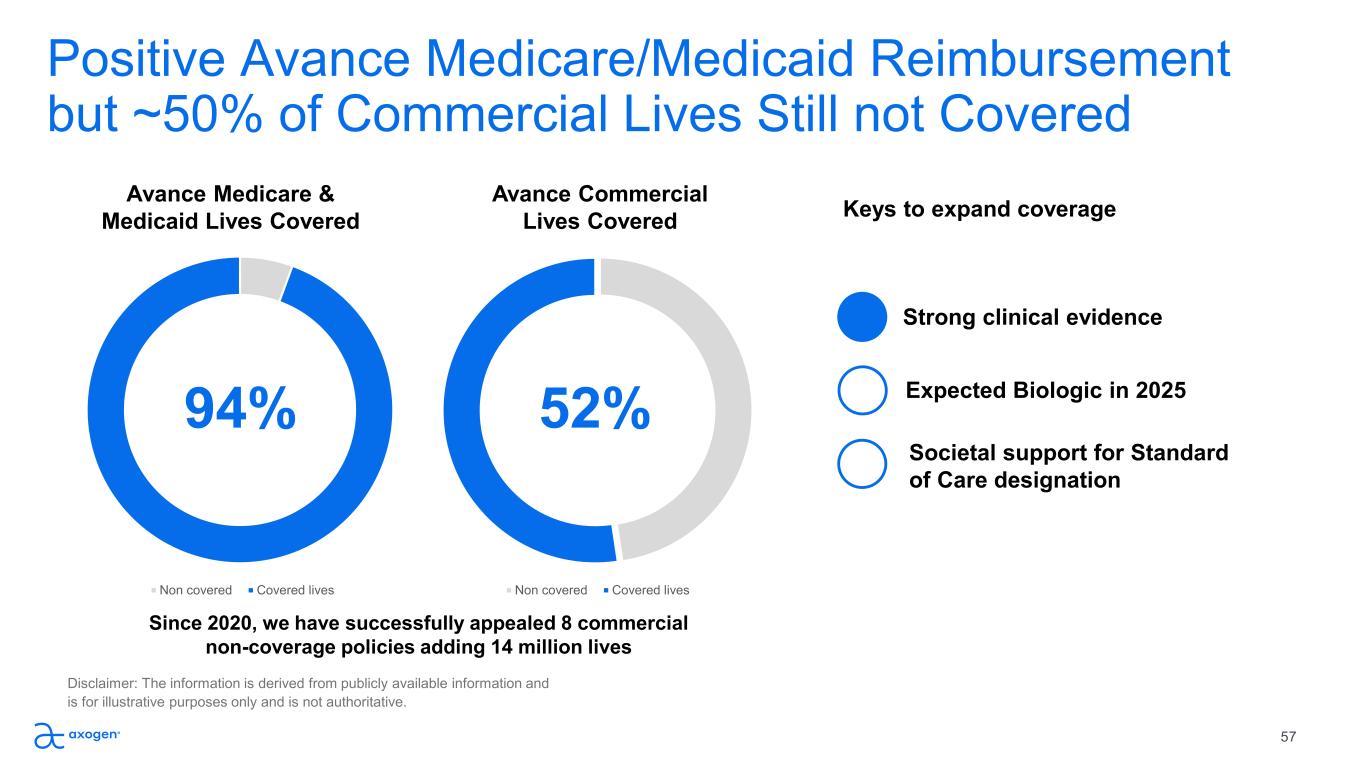 Positive Avance Medicare/Medicaid Reimbursement  but ~50% of Commercial Lives Still not Covered Non covered Covered lives 94% Non covered Covered lives 52% Keys to expand coverage Expected Biologic in 2025 Societal support for Standard  of Care designation Strong clinical evidence Avance Medicare &  Medicaid Lives Covered Avance Commercial Lives Covered Since 2020, we have successfully appealed 8 commercial  non-coverage policies adding 14 million lives 57 Disclaimer: The information is derived from publicly available information and  is for illustrative purposes only and is not authoritative.