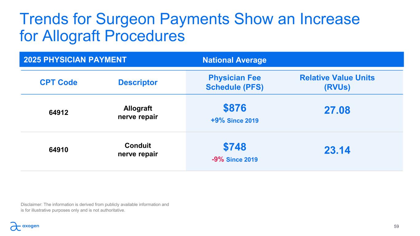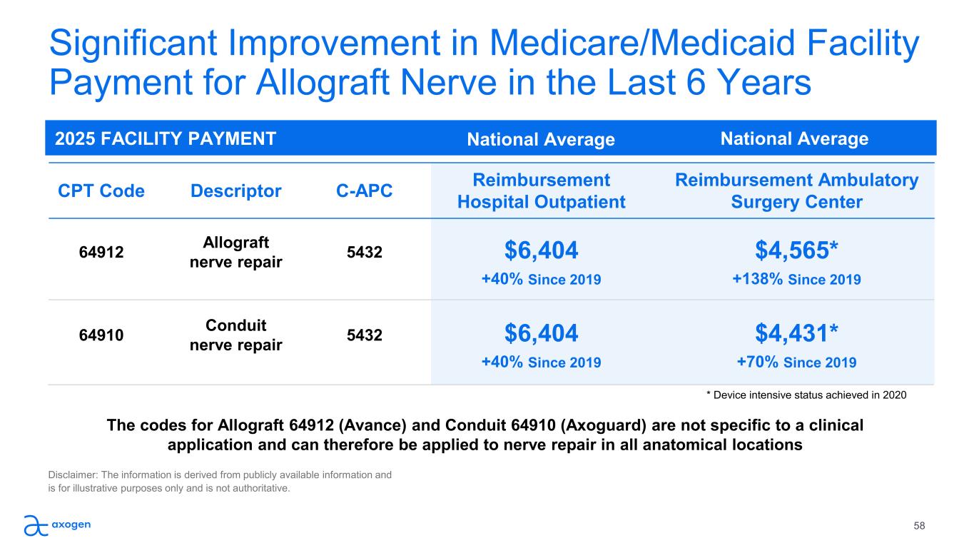 National Average2025 FACILITY PAYMENT Significant Improvement in Medicare/Medicaid Facility  Payment for Allograft Nerve in the Last 6 Years The codes for Allograft 64912 (Avance) and Conduit 64910 (Axoguard) are not specific to a clinical  application and can therefore be applied to nerve repair in all anatomical locations CPT Code Descriptor C-APC Reimbursement  Hospital Outpatient Reimbursement Ambulatory  Surgery Center 64912 Allograft  nerve repair 5432 $6,404 $4,565* +40% Since 2019 +138% Since 2019 64910 Conduit  nerve repair 5432 $6,404 $4,431* +40% Since 2019 +70% Since 2019 National Average Disclaimer: The information is derived from publicly available information and  is for illustrative purposes only and is not authoritative. 58 * Device intensive status achieved in 2020