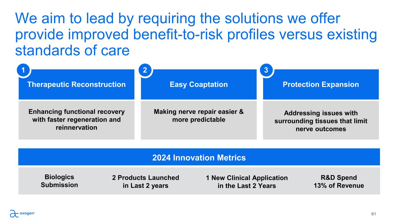 Easy Coaptation We aim to lead by requiring the solutions we offer  provide improved benefit-to-risk profiles versus existing  standards of care Therapeutic Reconstruction Enhancing functional recovery  with faster regeneration and  reinnervation Addressing issues with  surrounding tissues that limit  nerve outcomes  Protection Expansion 2 Products Launched  in Last 2 years R&D Spend 13% of Revenue 1 New Clinical Application  in the Last 2 Years  Biologics  Submission 2024 Innovation Metrics Making nerve repair easier &  more predictable 1 2 3 61