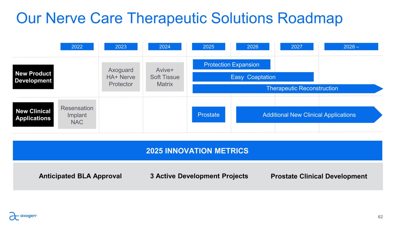 Our Nerve Care Therapeutic Solutions Roadmap 2023 2024 2025 2026 2027 2028 –2022 New Product  Development New Clinical  Applications Prostate Easy  Coaptation Protection Expansion Therapeutic Reconstruction 2025 INNOVATION METRICS Additional New Clinical Applications 3 Active Development Projects Prostate Clinical DevelopmentAnticipated BLA Approval Avive+  Soft Tissue  Matrix Axoguard  HA+ Nerve  Protector Resensation  Implant  NAC 62