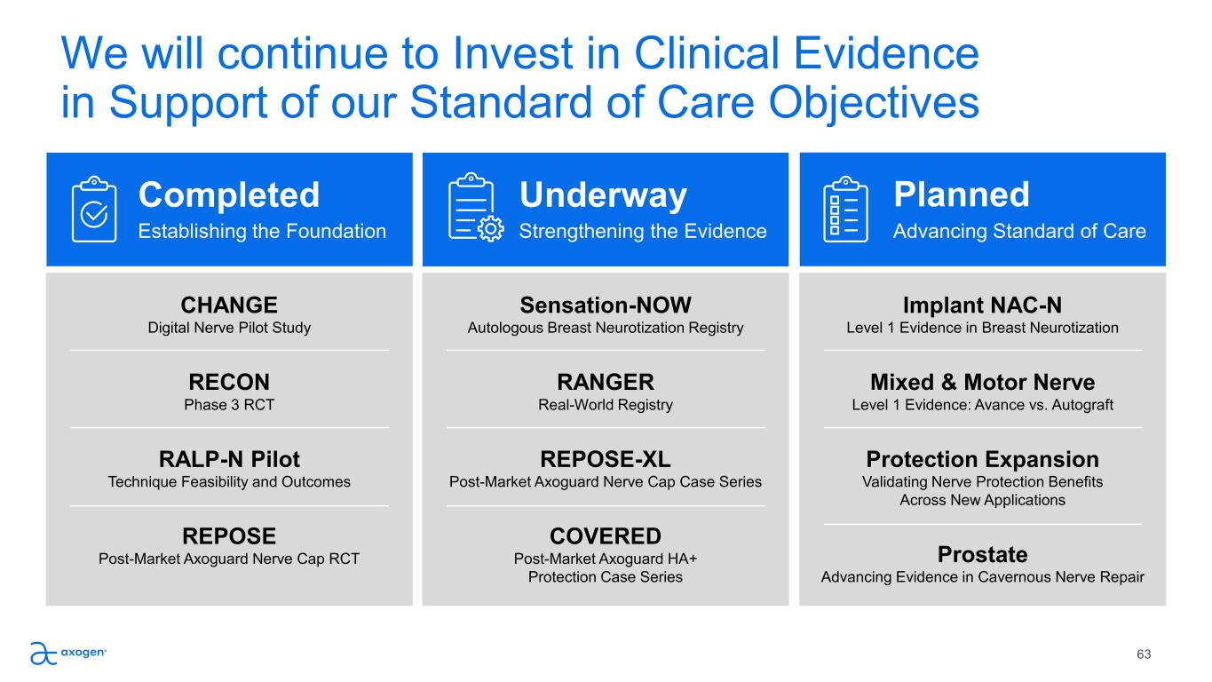 We will continue to Invest in Clinical Evidence  in Support of our Standard of Care Objectives  Completed CHANGE Digital Nerve Pilot Study RECON Phase 3 RCT  RALP-N Pilot Technique Feasibility and Outcomes REPOSE Post-Market Axoguard Nerve Cap RCT Underway Planned Establishing the Foundation Strengthening the Evidence Advancing Standard of Care Sensation-NOW Autologous Breast Neurotization Registry RANGER Real-World Registry  REPOSE-XL Post-Market Axoguard Nerve Cap Case Series COVERED Post-Market Axoguard HA+  Protection Case Series  Implant NAC-N Level 1 Evidence in Breast Neurotization Mixed & Motor Nerve Level 1 Evidence: Avance vs. Autograft Protection Expansion Validating Nerve Protection Benefits  Across New Applications Prostate Advancing Evidence in Cavernous Nerve Repair 63