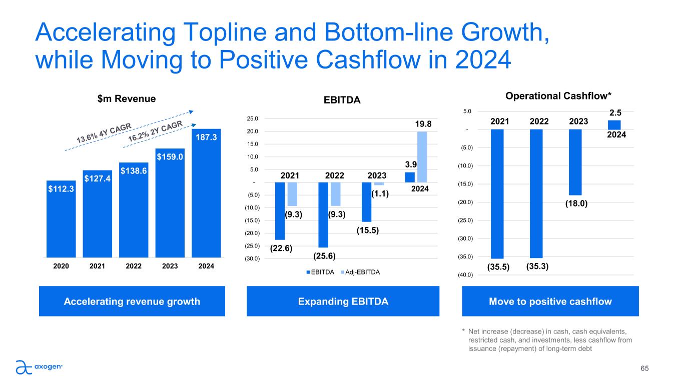 $112.3 $127.4 $138.6 $159.0 187.3 2020 2021 2022 2023 2024 $m Revenue Accelerating Topline and Bottom-line Growth,  while Moving to Positive Cashflow in 2024 Accelerating revenue growth Move to positive cashflow 65 (35.5) (35.3) (18.0) 2.5   (40.0)  (35.0)  (30.0)  (25.0)  (20.0)  (15.0)  (10.0)  (5.0)  -  5.0 2021 2022 2023 2024 * Net increase (decrease) in cash, cash equivalents,  restricted cash, and investments, less cashflow from  issuance (repayment) of long-term debt Operational Cashflow* Expanding EBITDA (22.6) (25.6) (15.5) 3.9  (9.3) (9.3) (1.1) 19.8   (30.0)  (25.0)  (20.0)  (15.0)  (10.0)  (5.0)  -  5.0  10.0  15.0  20.0  25.0 EBITDA EBITDA Adj-EBITDA 2021 2022 2023 2024