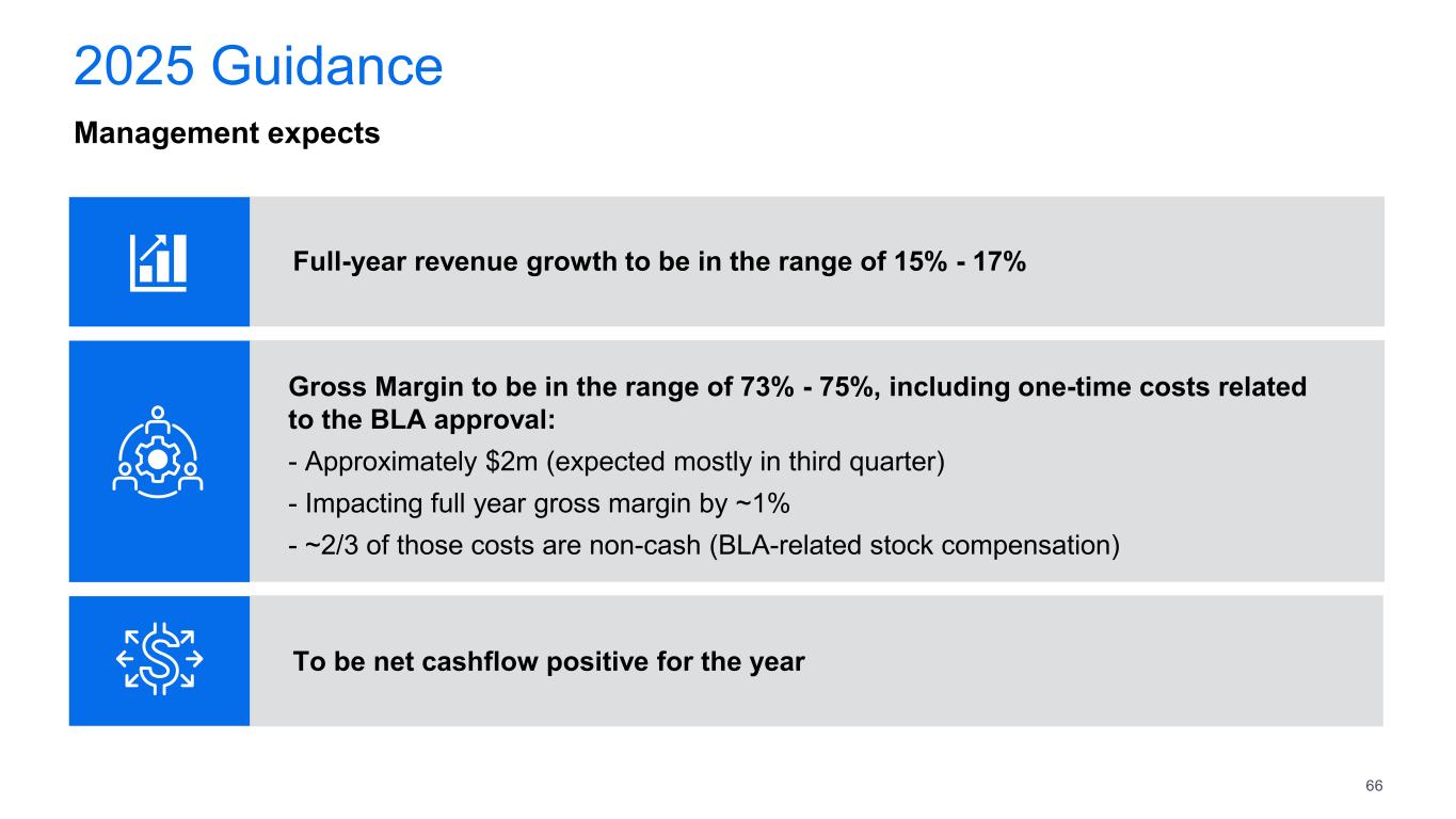 2025 Guidance Management expects Full-year revenue growth to be in the range of 15% - 17% Gross Margin to be in the range of 73% - 75%, including one-time costs related  to the BLA approval: - Approximately $2m (expected mostly in third quarter) - Impacting full year gross margin by ~1% - ~2/3 of those costs are non-cash (BLA-related stock compensation) To be net cashflow positive for the year 66